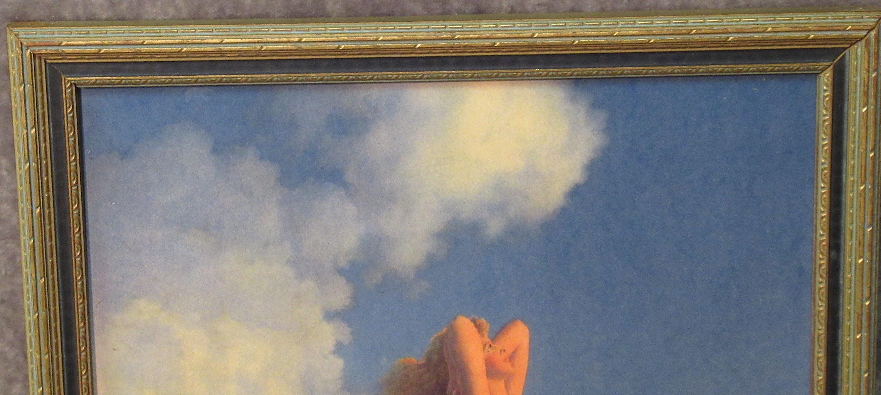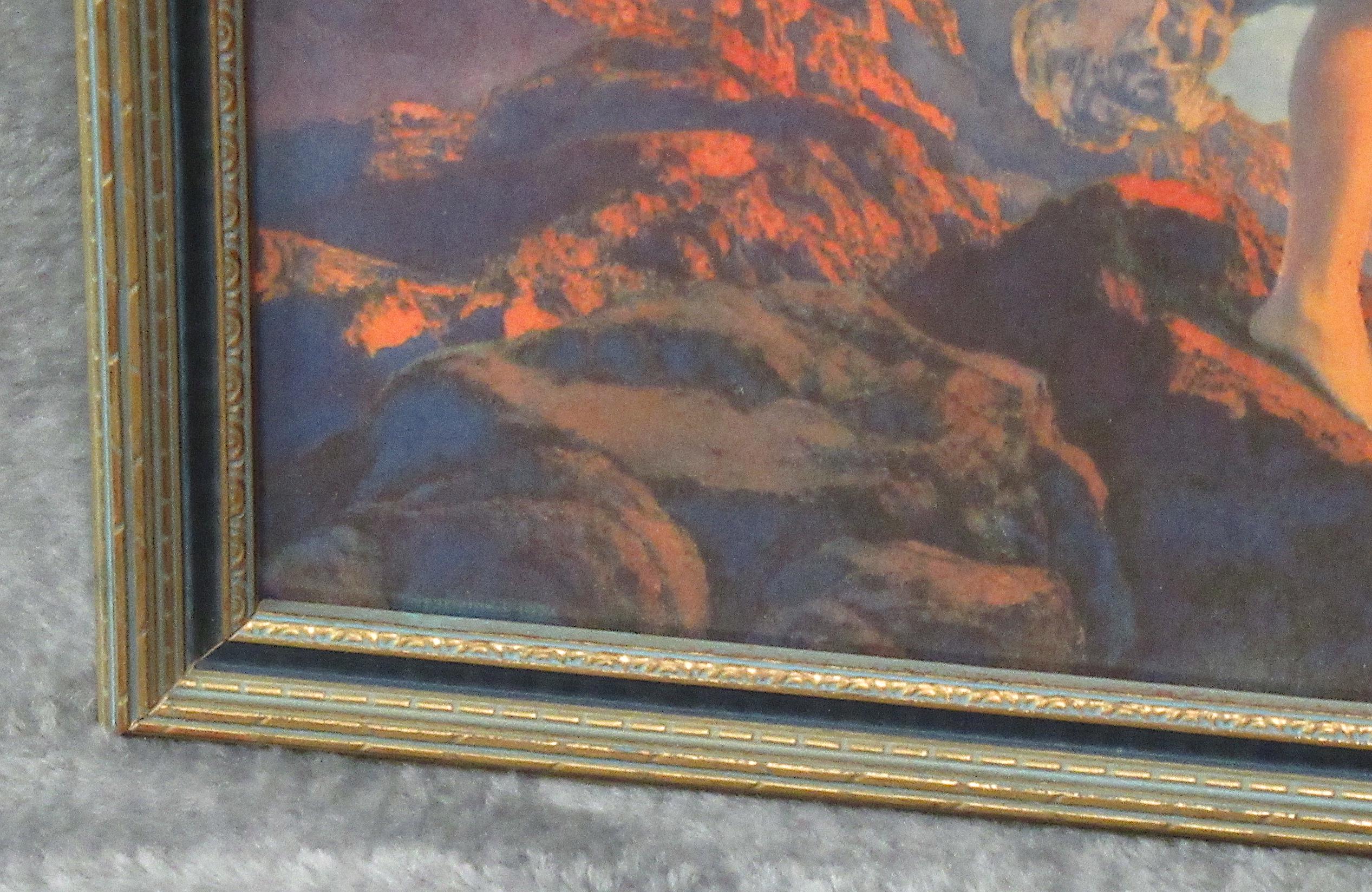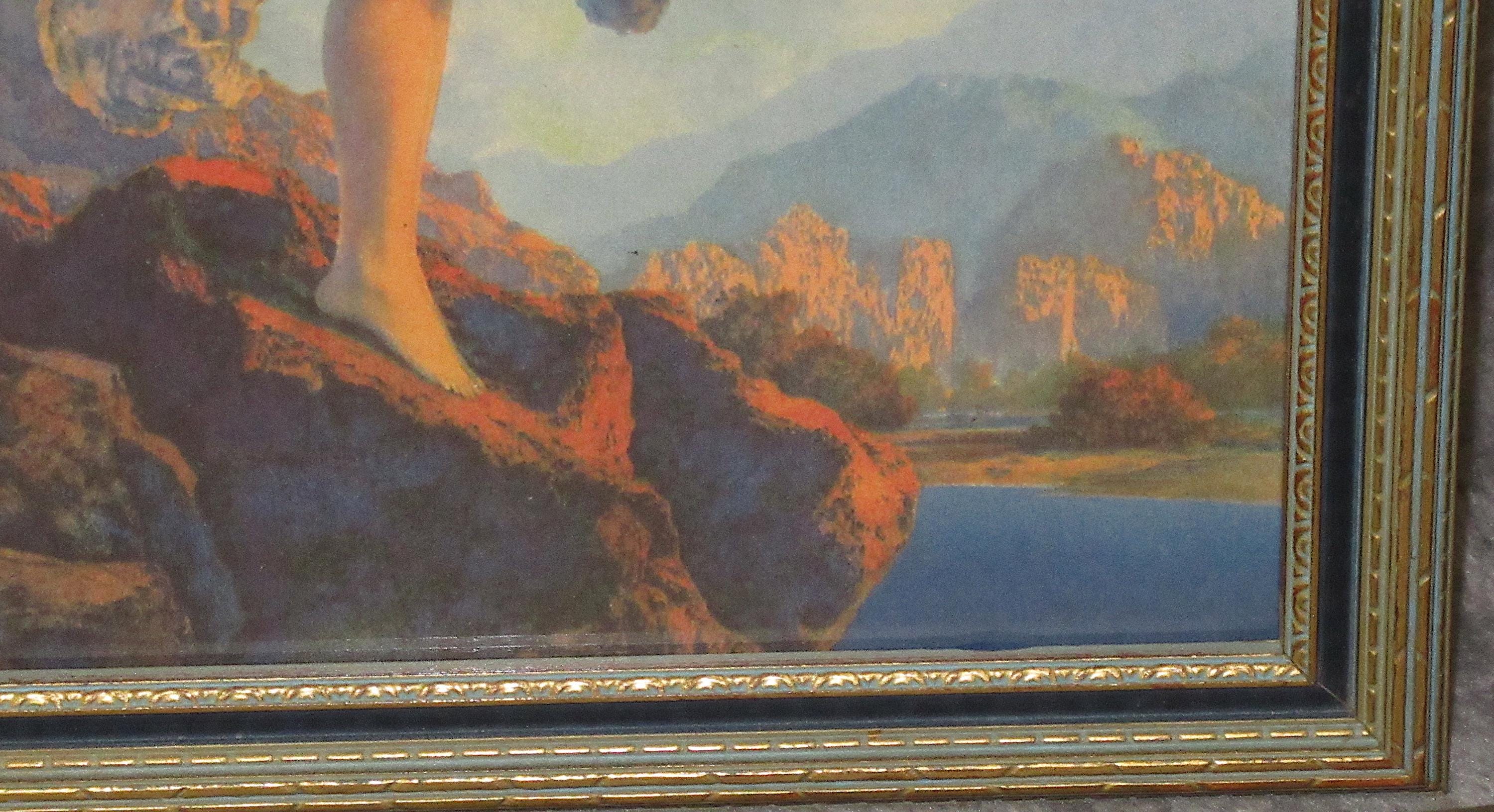 Maxfield Parrish art print, dont think this is original to the frame, but im sure its not from a recent calendar or print from magazine. Beautiful Early 1900s antique wood frame in super condition !!