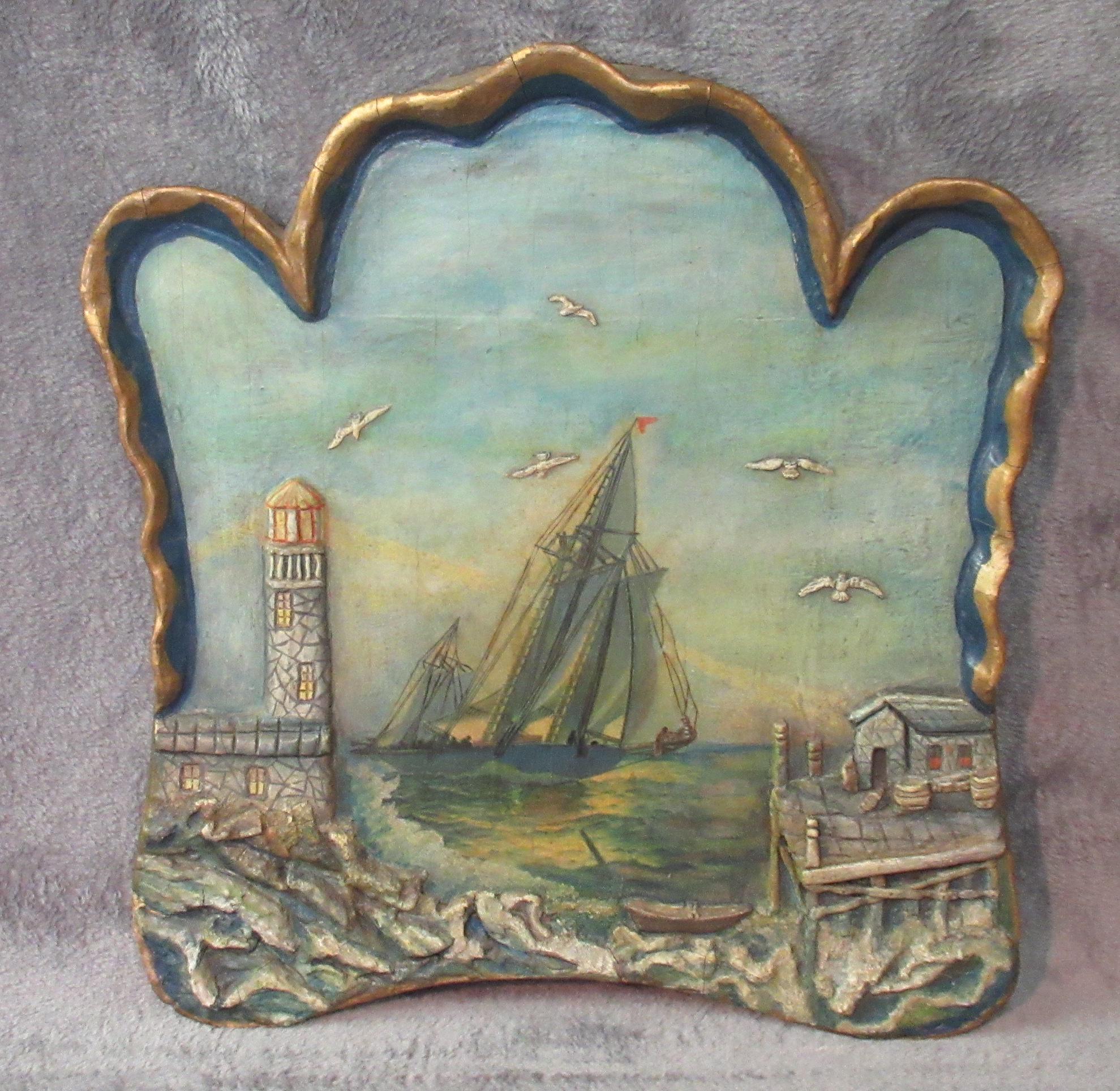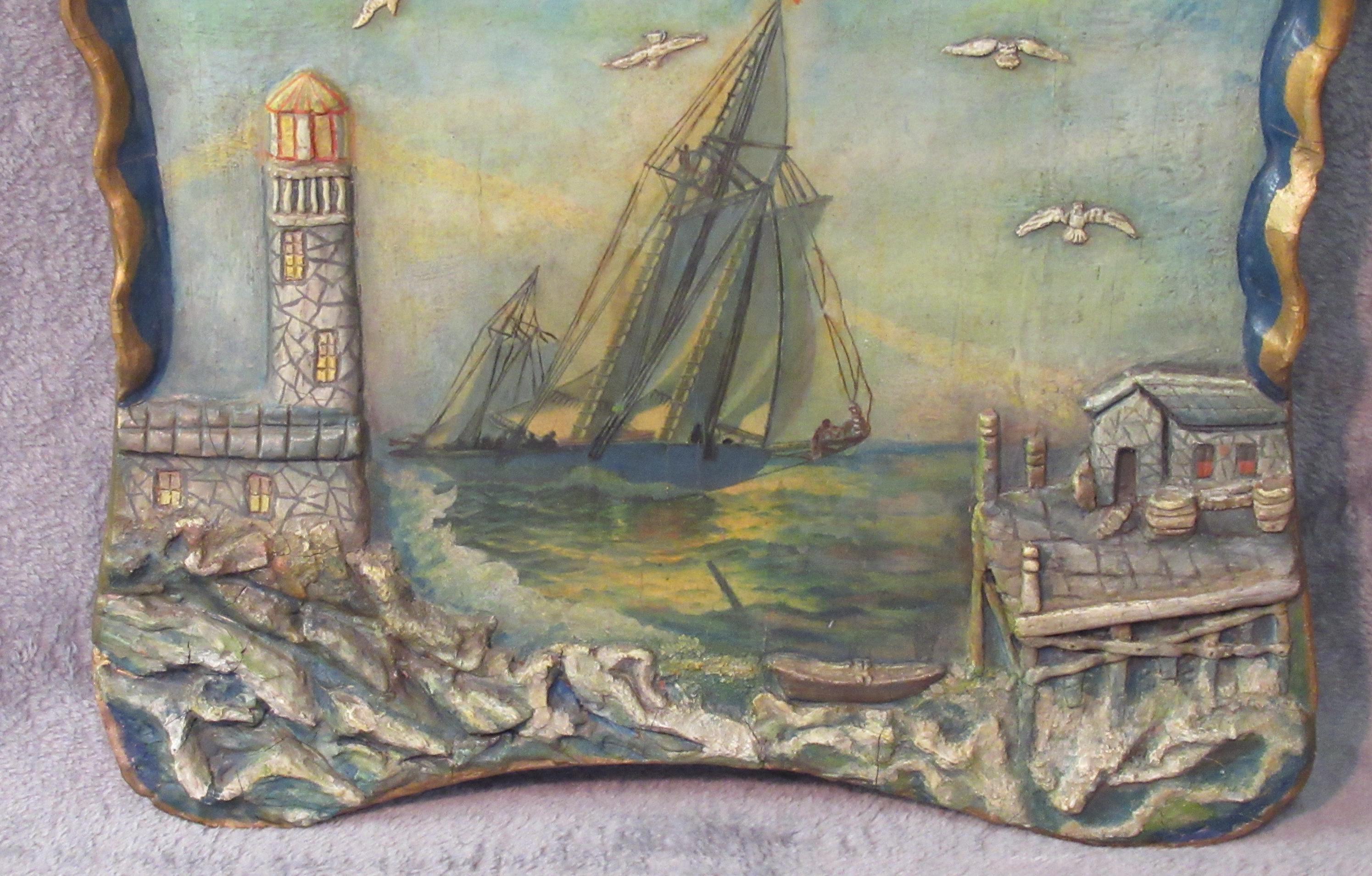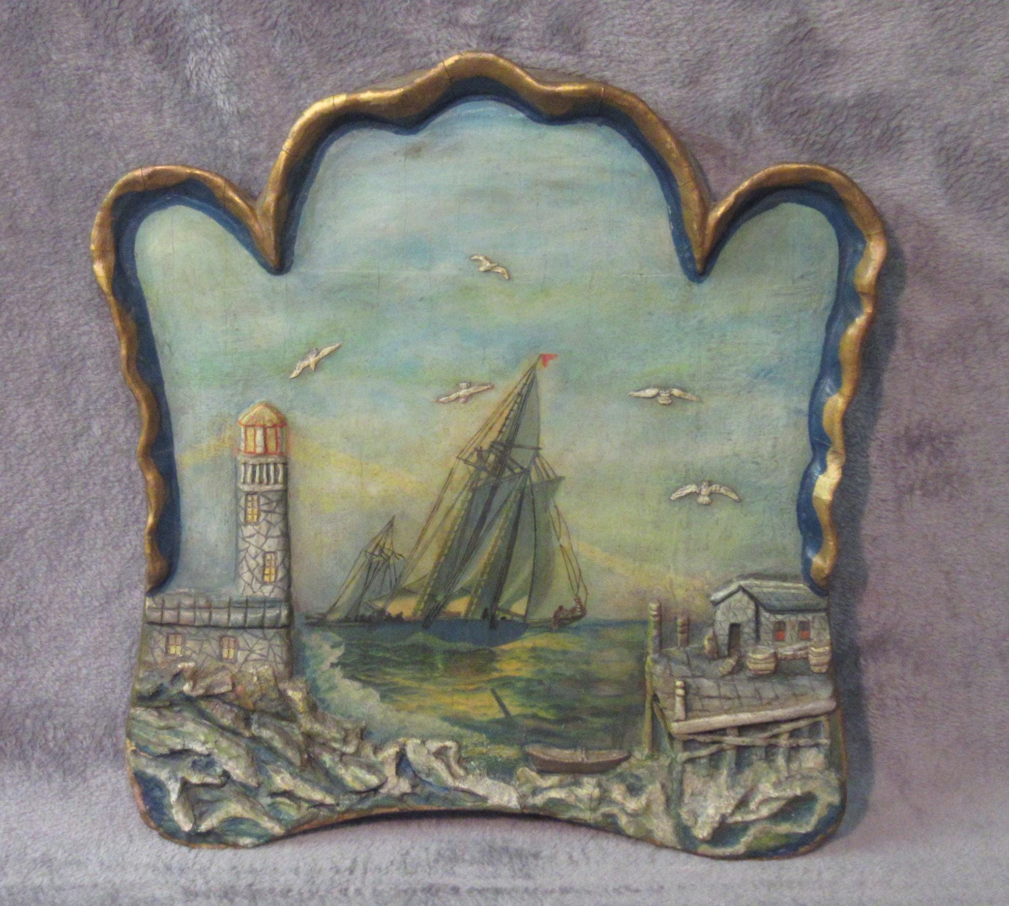Unique Multi Media Mid/ Early 1900s Century. Painting with carved three dimensional clay foreground sculpture, lighthouse, dock and individual gulls . Fun naive folk art, piecrust type top. excellent condition. Approx 15.5 X 14 /