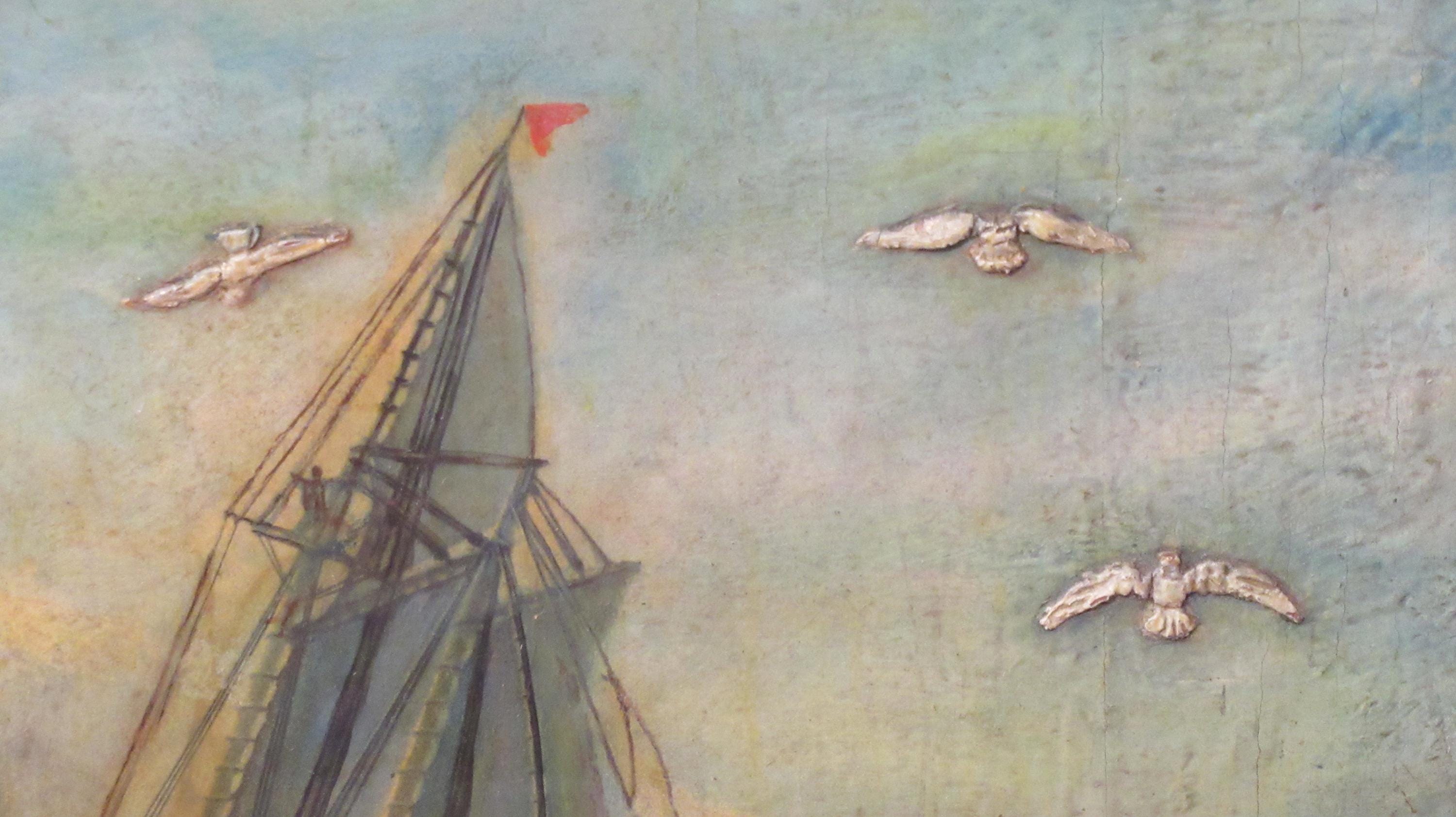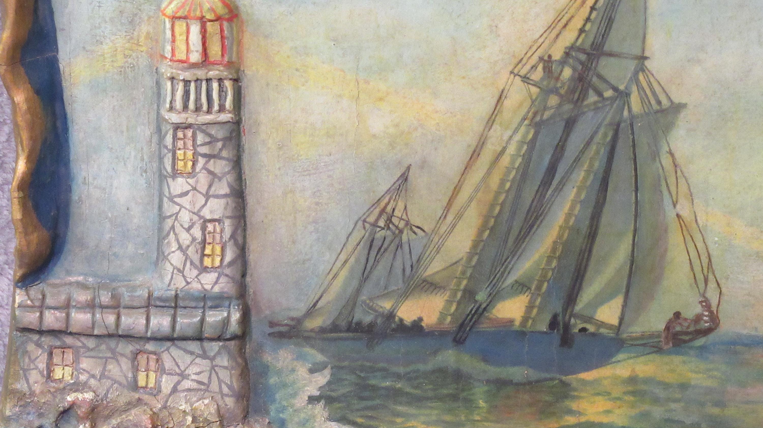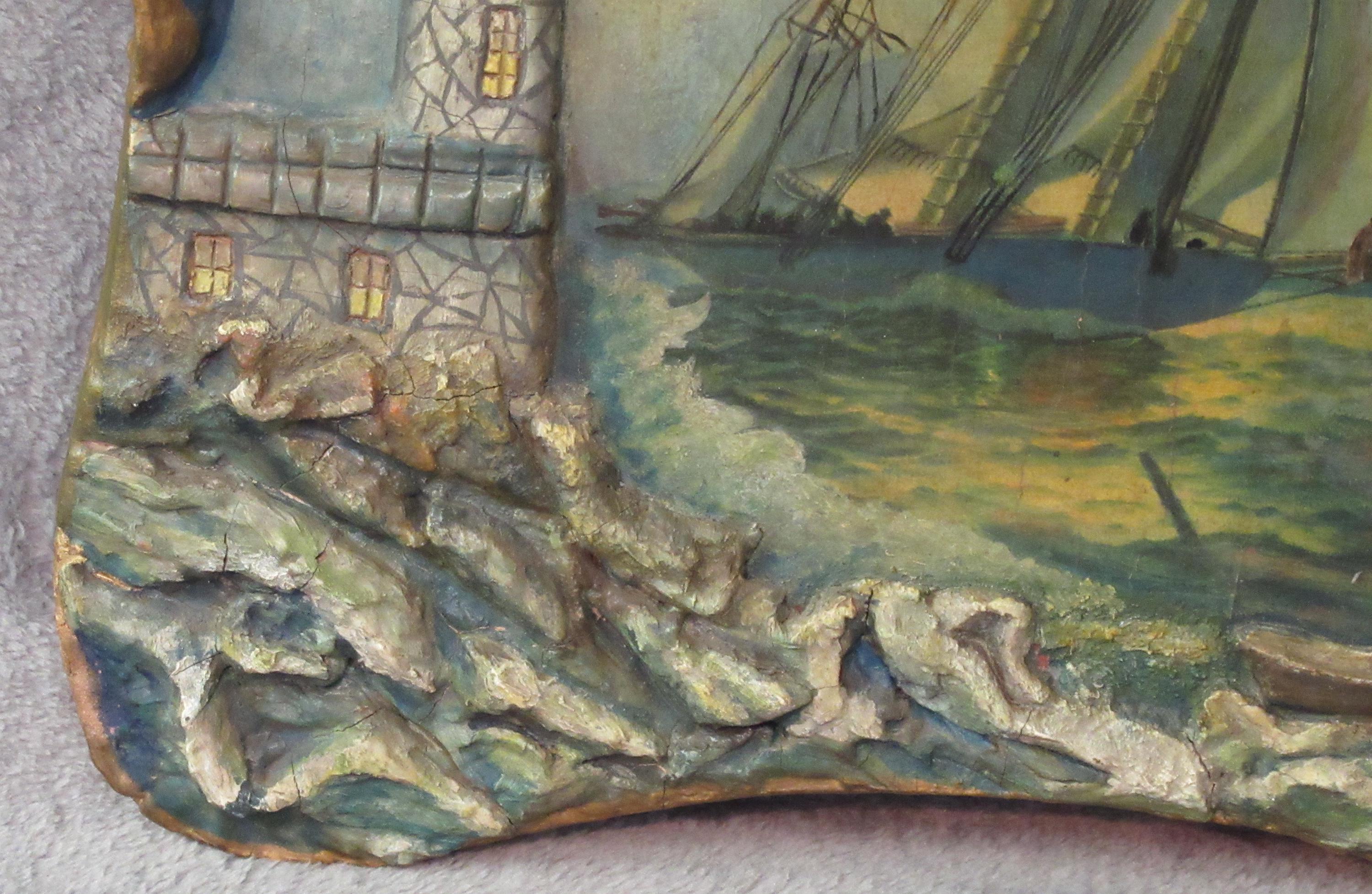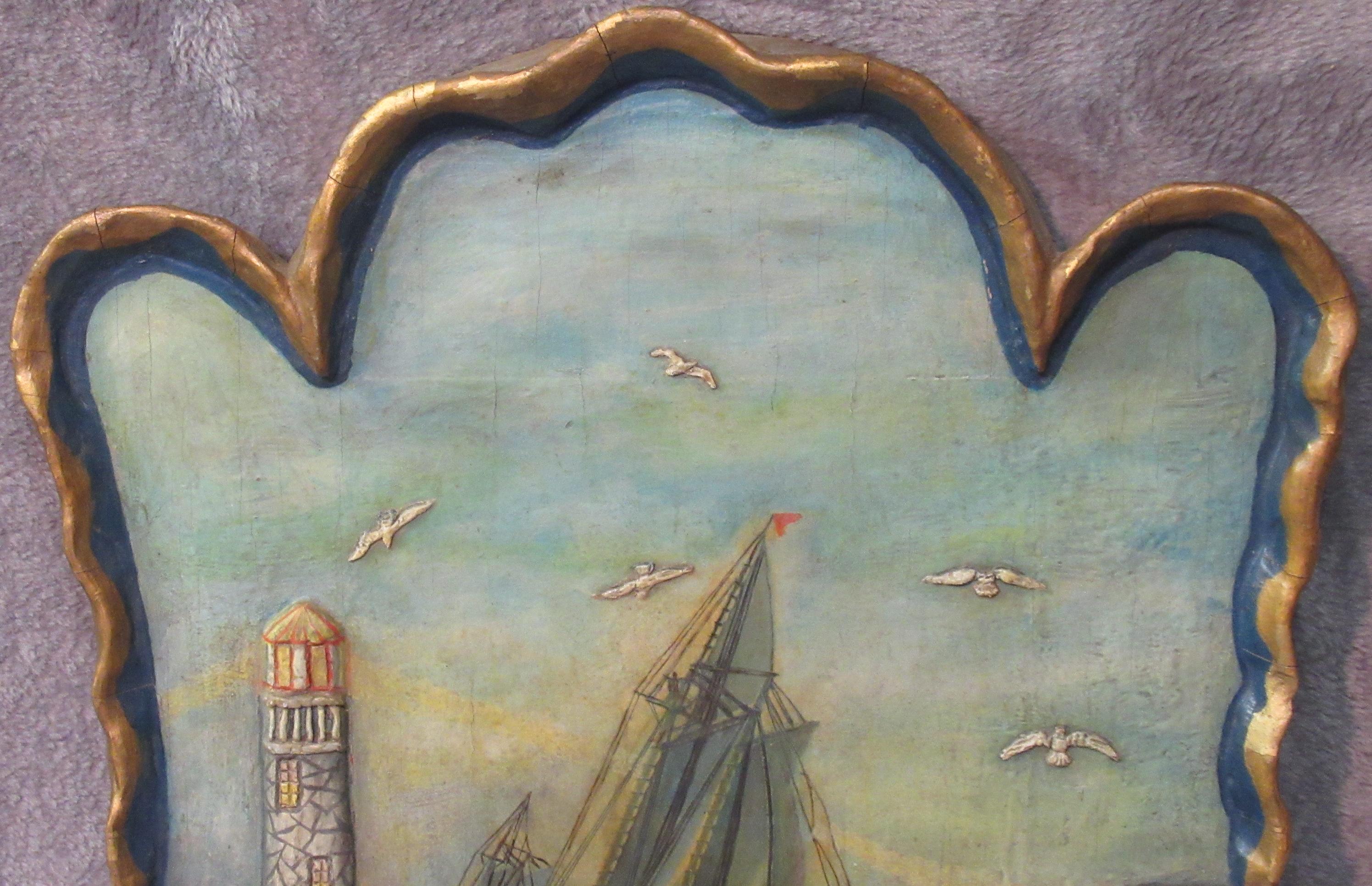 Unique Multi Media Mid/ Early 1900s Century. Painting with carved three dimensional clay foreground sculpture, lighthouse, dock and individual gulls . Fun naive folk art, piecrust type top. excellent condition. Approx 15.5 X 14 /