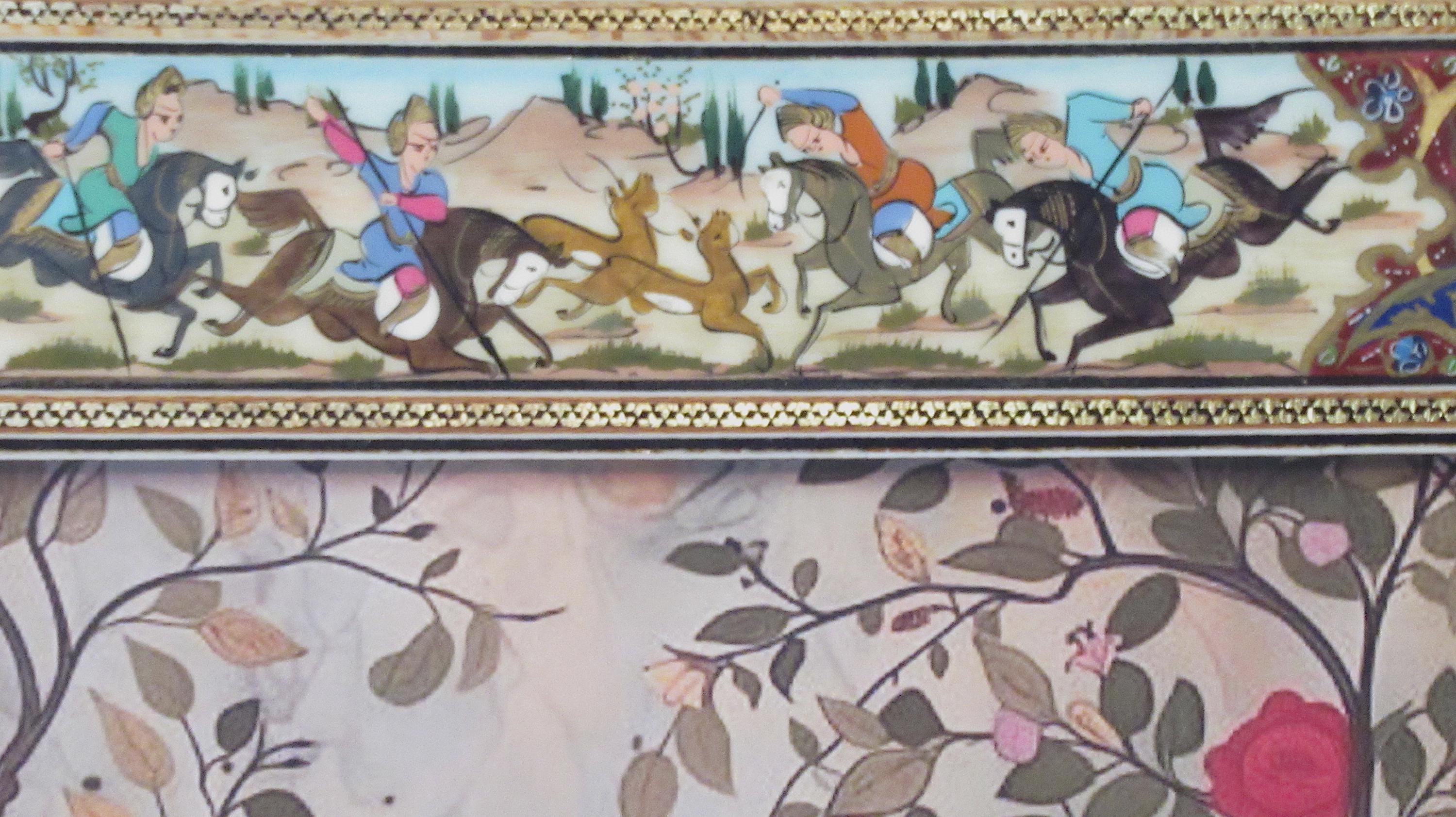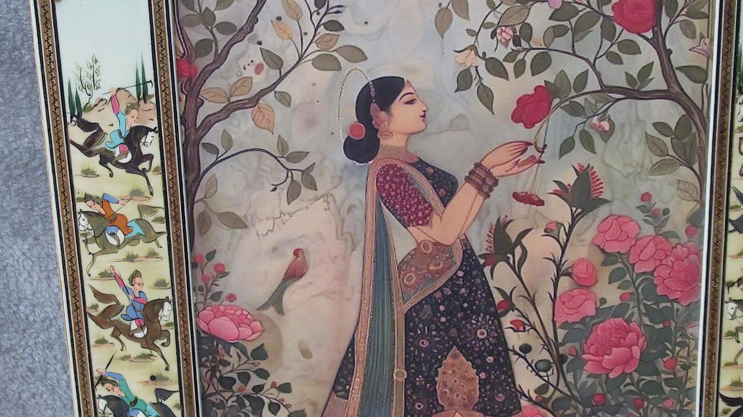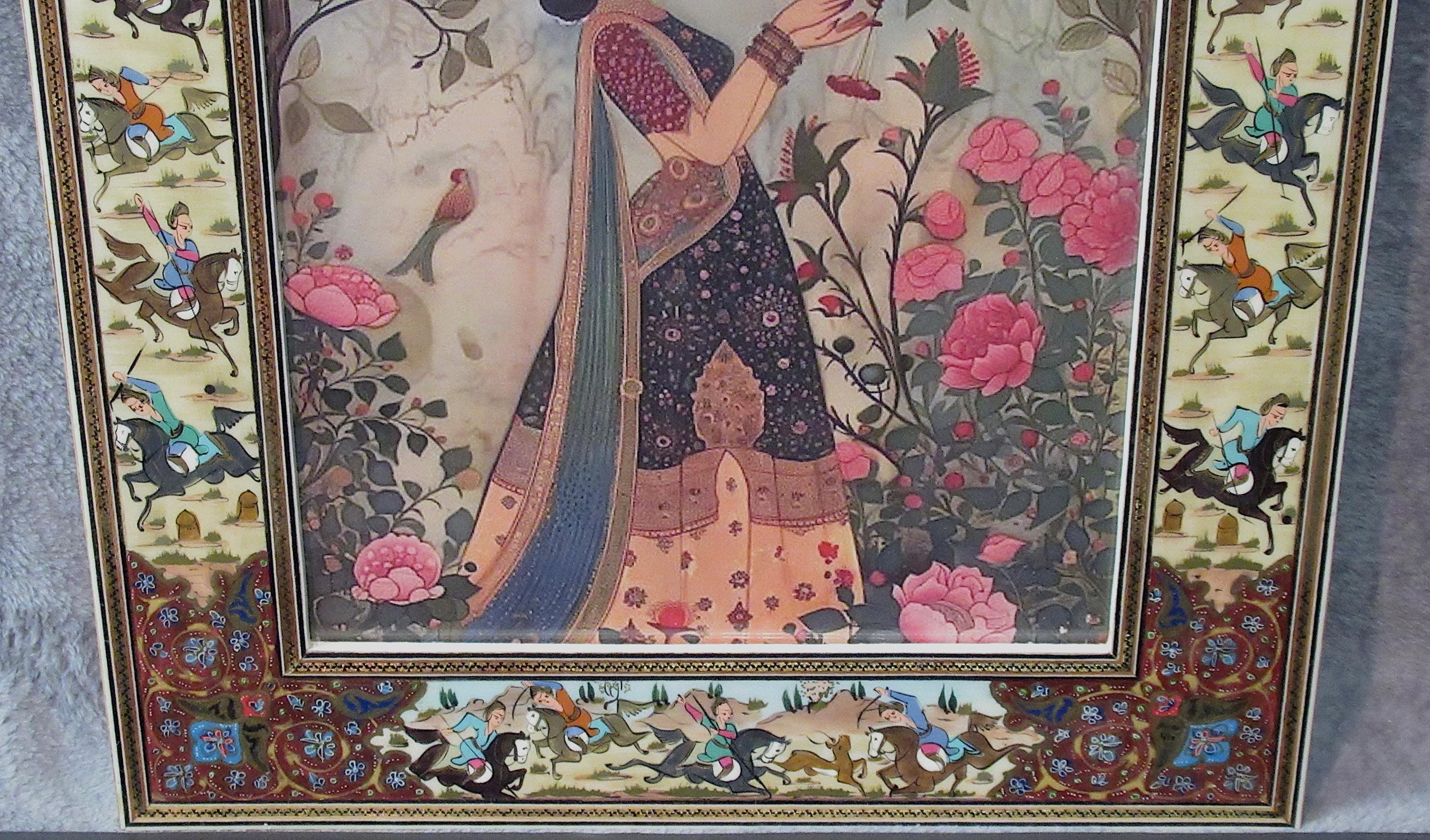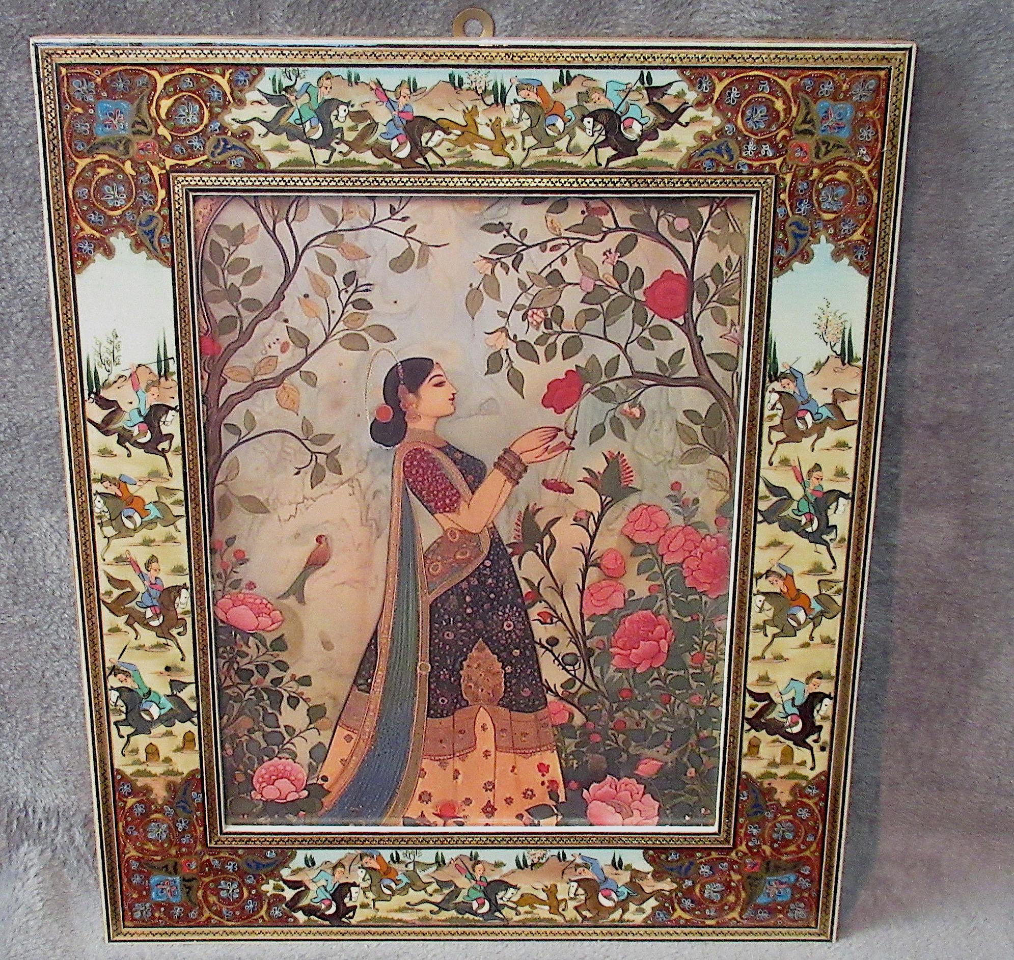 Persian design with extremely detailed painting and inlay with a high gloss finish highlight this vintage frame. Woman in garden art print