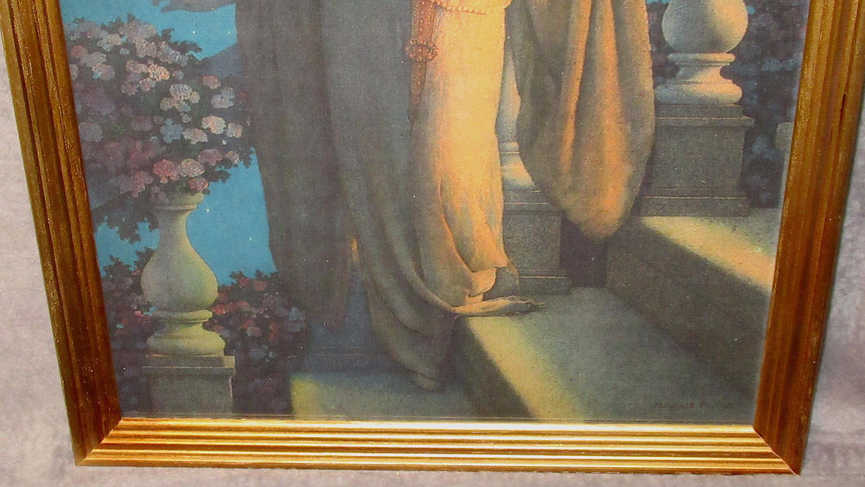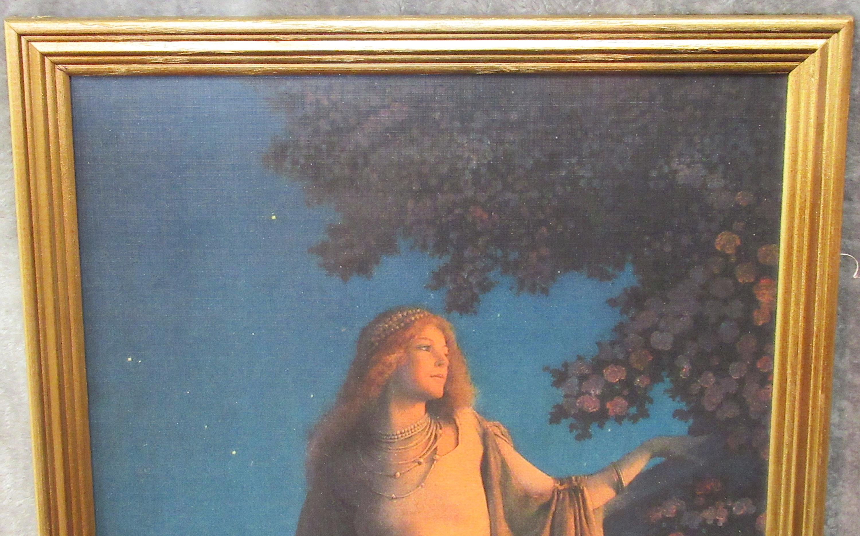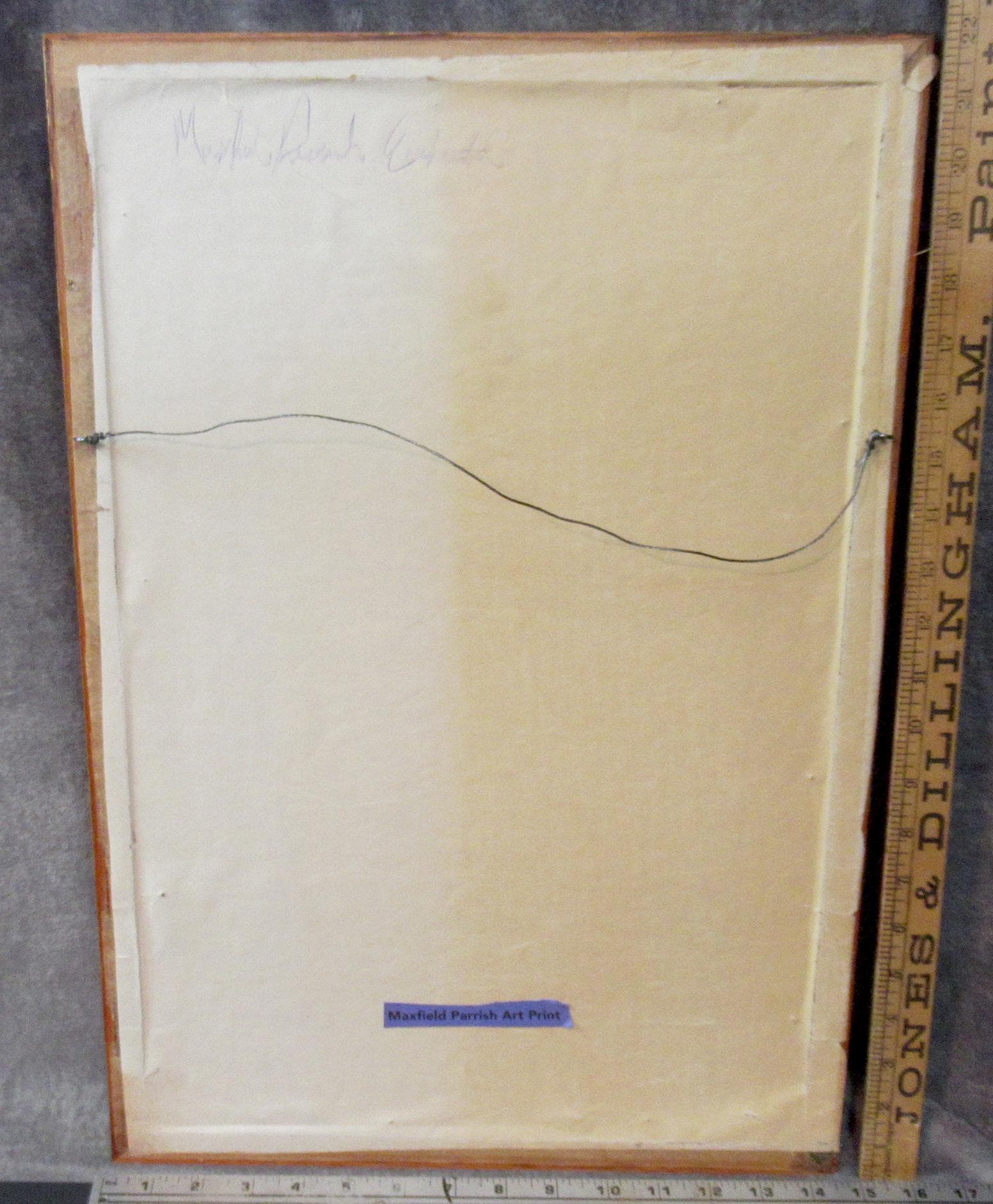 Maxfield Parrish art print, excellent color, unique, appears to be printed on linen textured print. perfect condition. Vintage wood frame