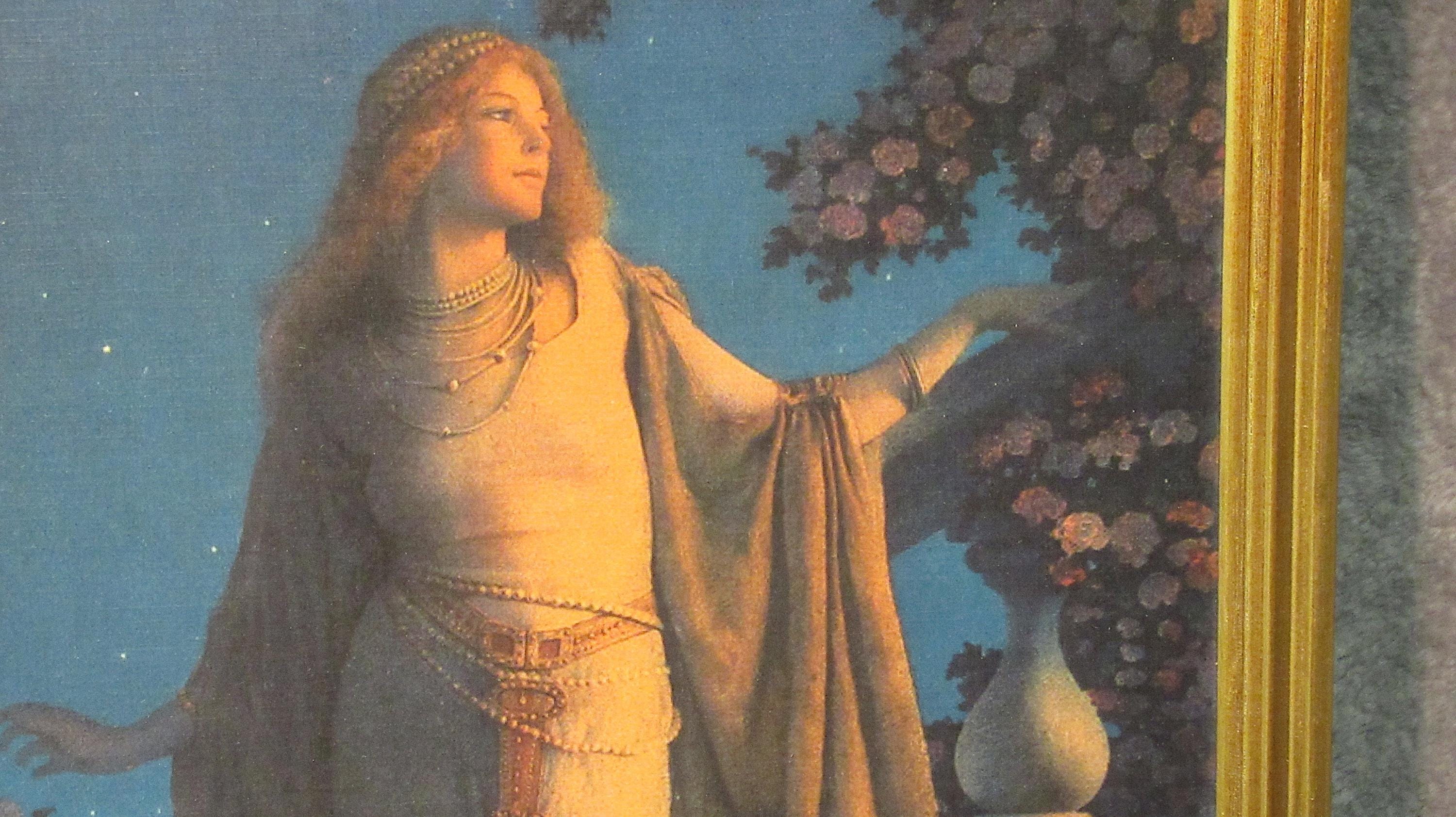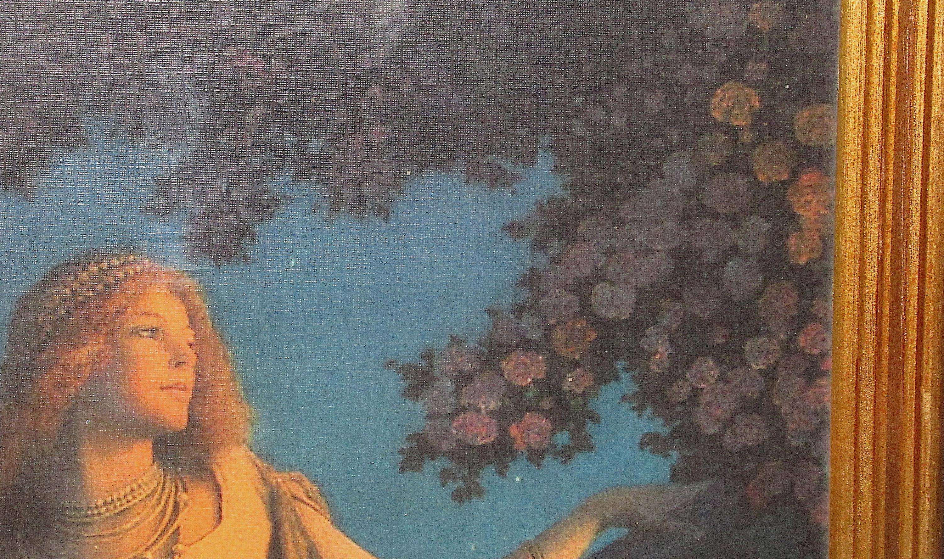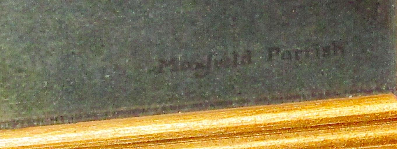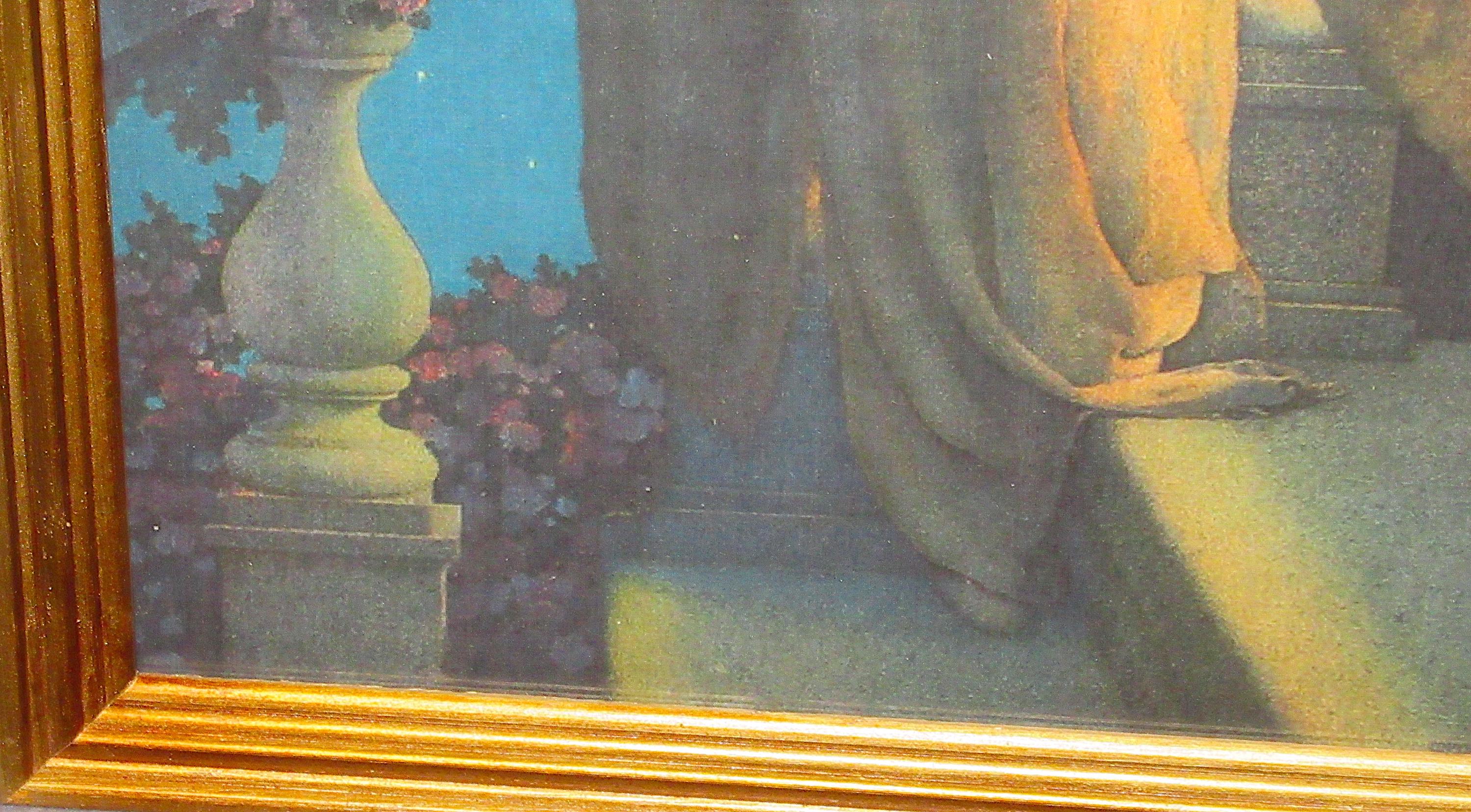 Maxfield Parrish art print, excellent color, unique, appears to be printed on linen textured print. perfect condition. Vintage wood frame