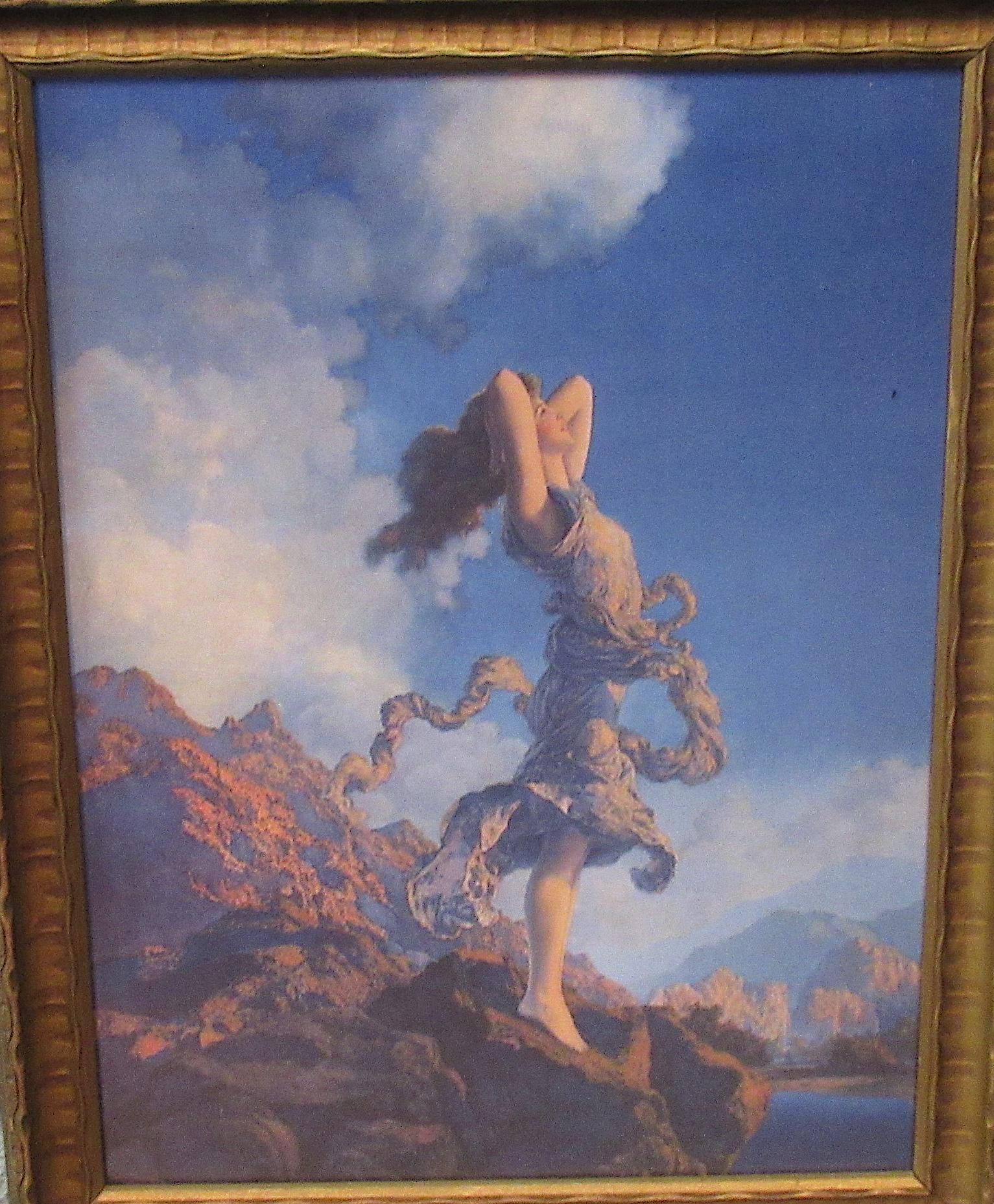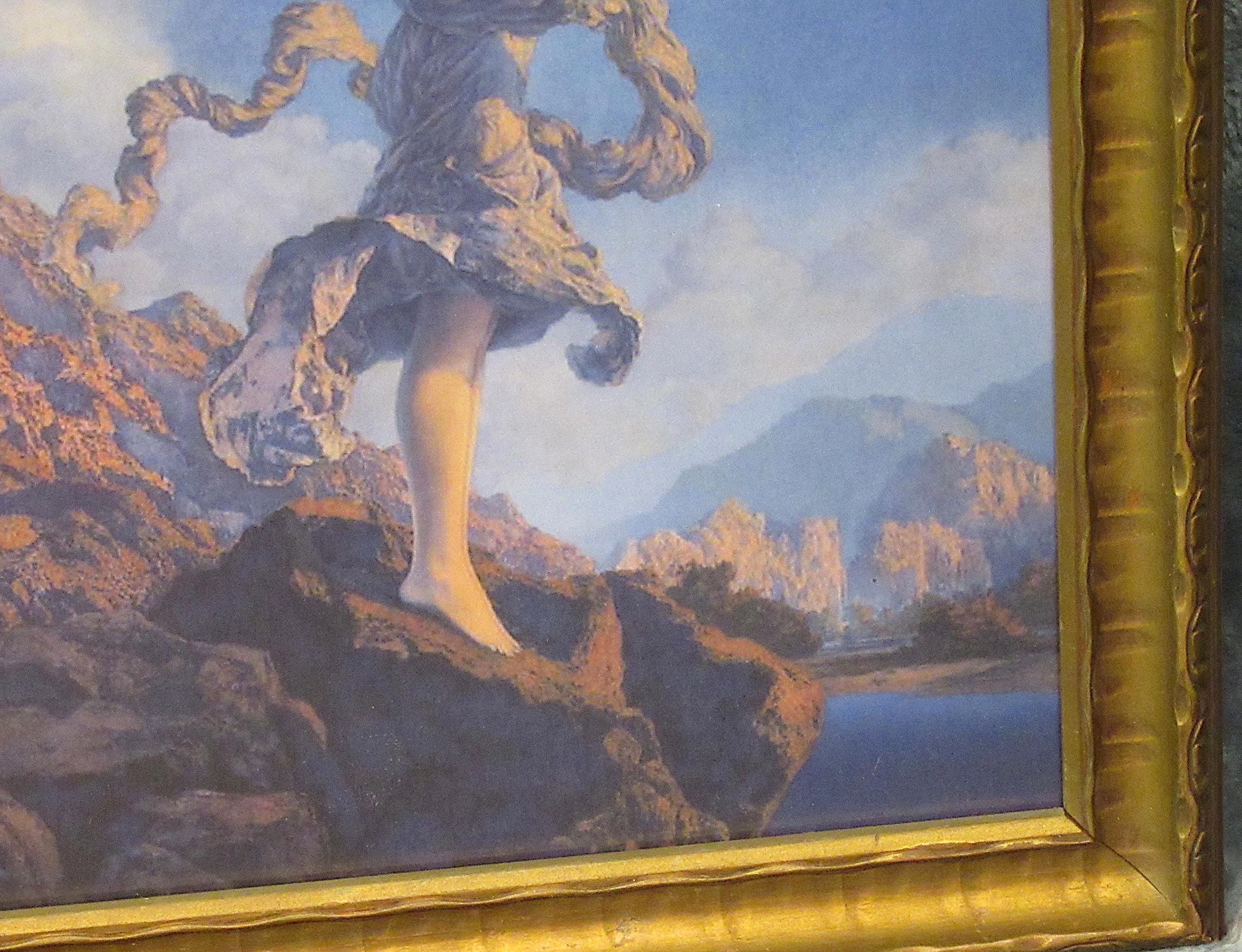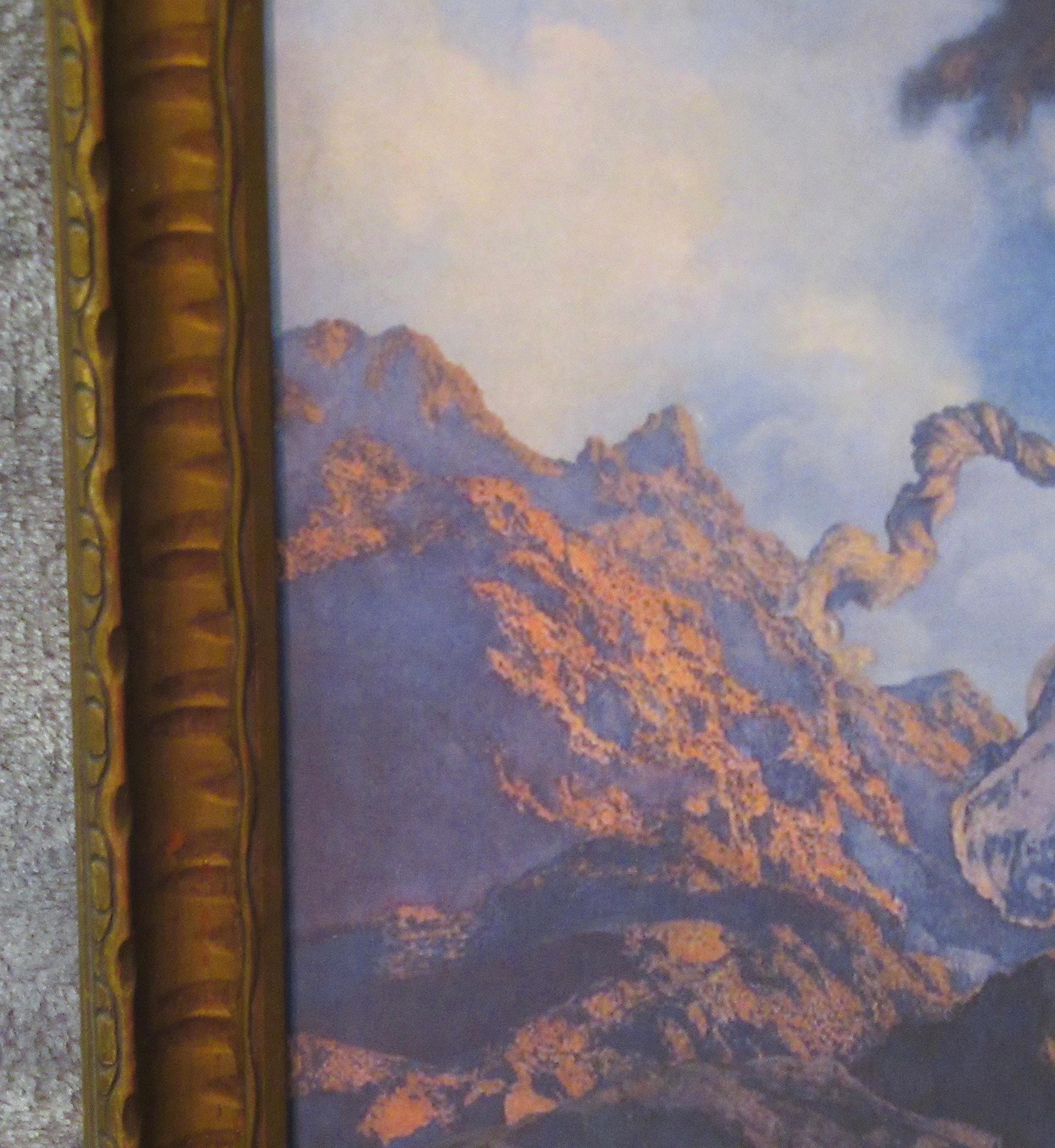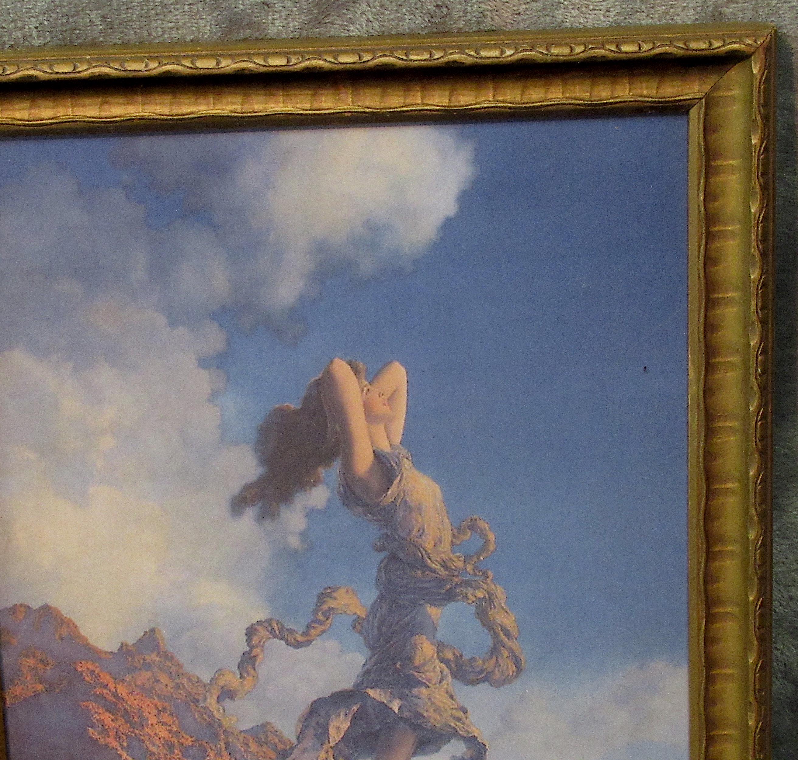 Maxfield Parrish art print, dont think this is original to the frame, but im sure its not from a recent calendar or print from magazine. Early 1900s antique wood frame in very fine condition. Beautiful color and detail, . Golden Age Illustrator, painter and illustrator. Maxfield Parrish, signed