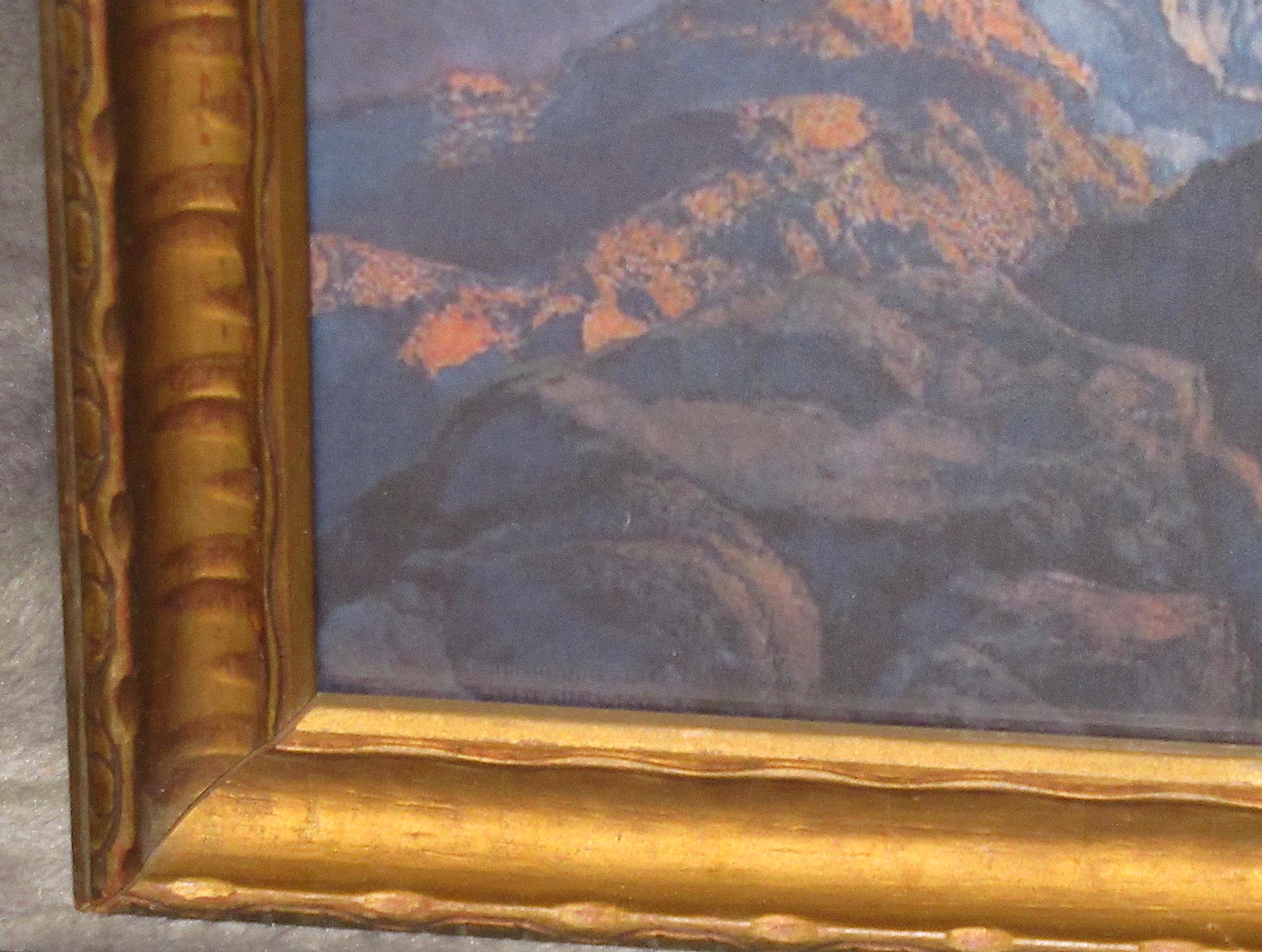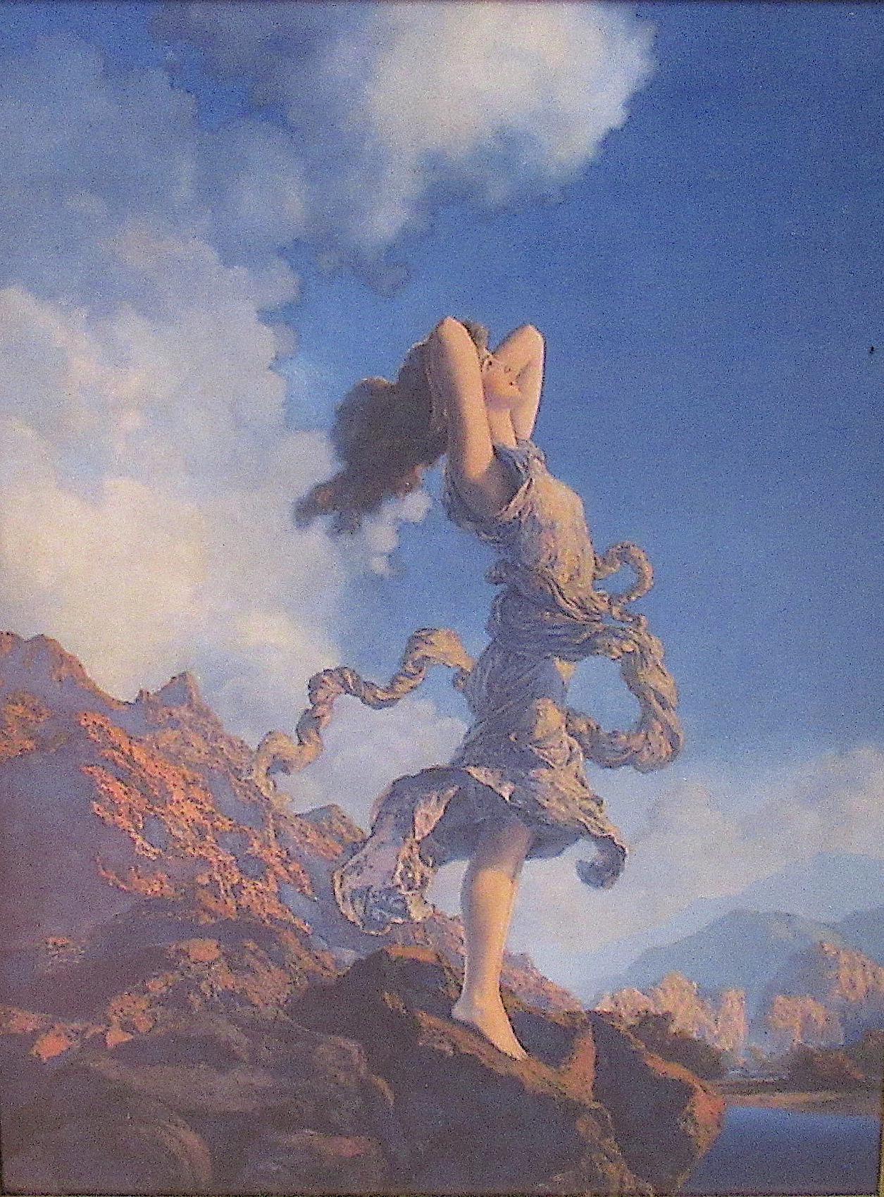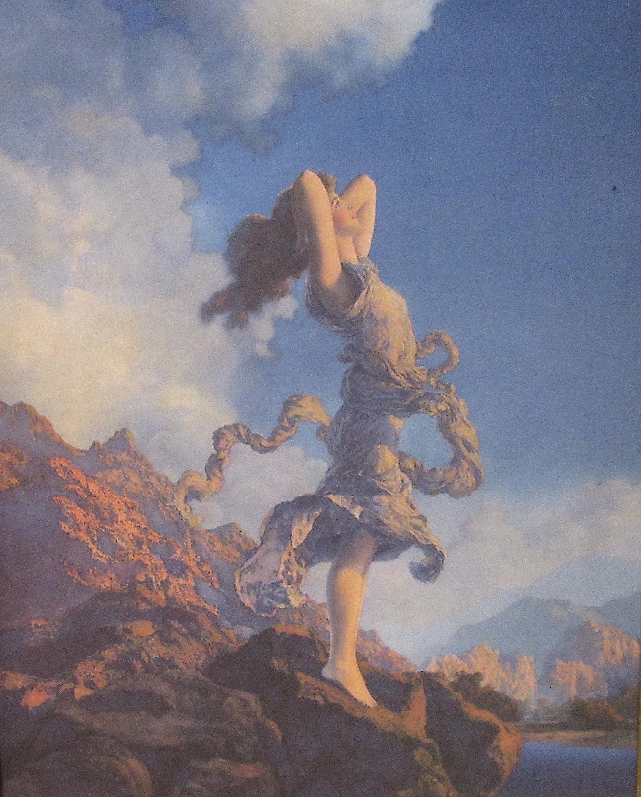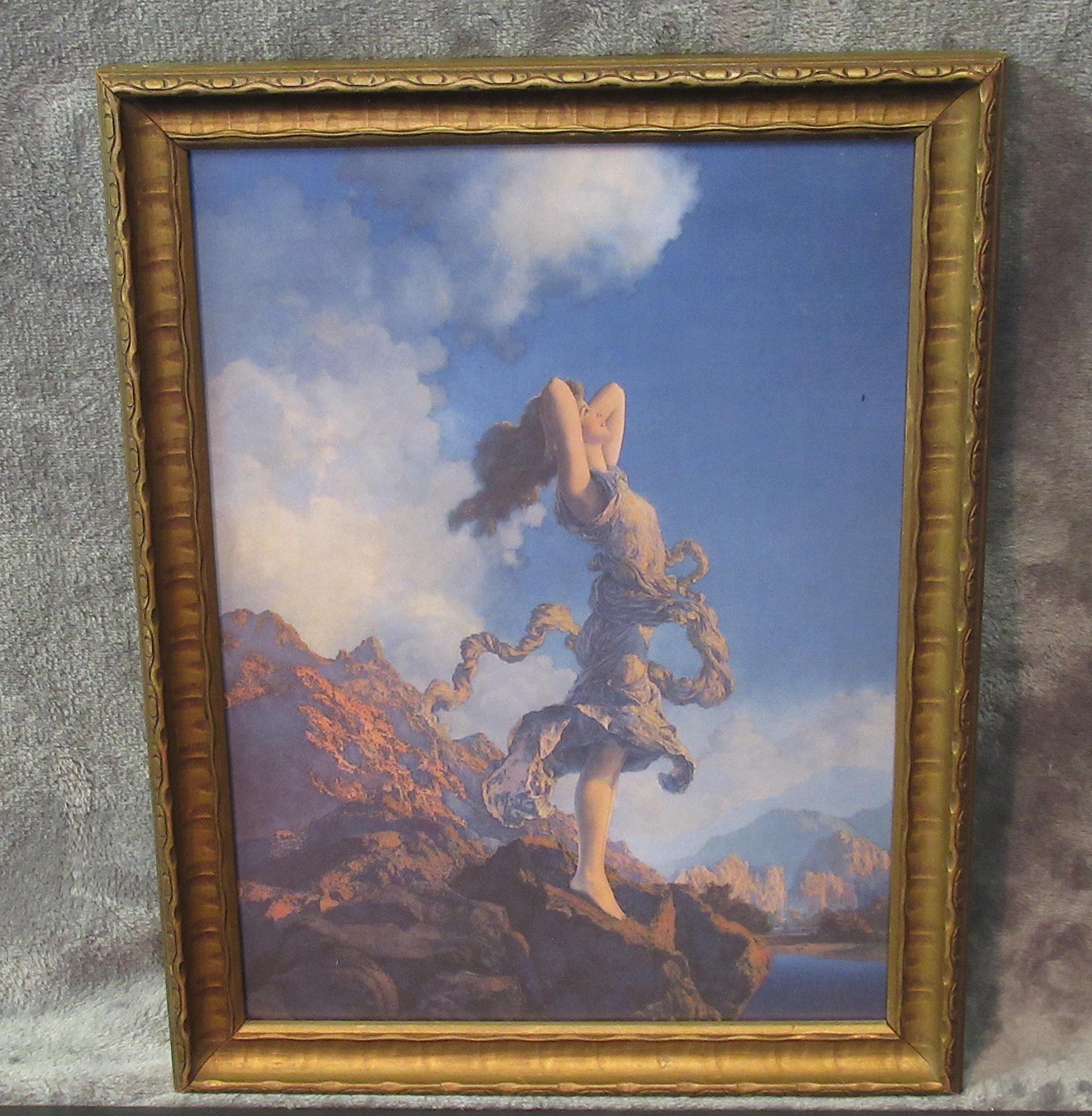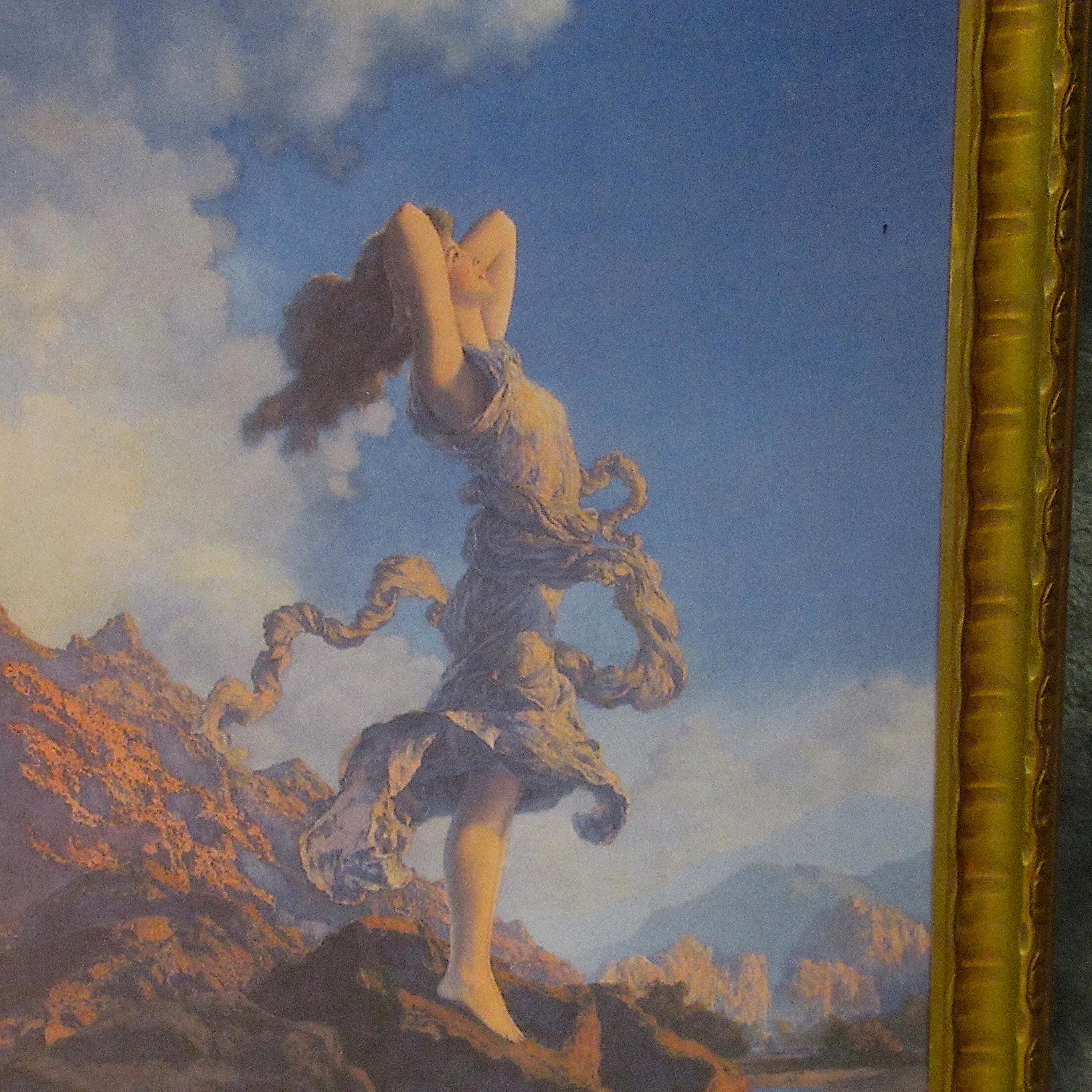Maxfield Parrish art print, dont think this is original to the frame, but im sure its not from a recent calendar or print from magazine. Early 1900s antique wood frame in very fine condition. Beautiful color and detail, . Golden Age Illustrator, painter and illustrator. Maxfield Parrish, signed