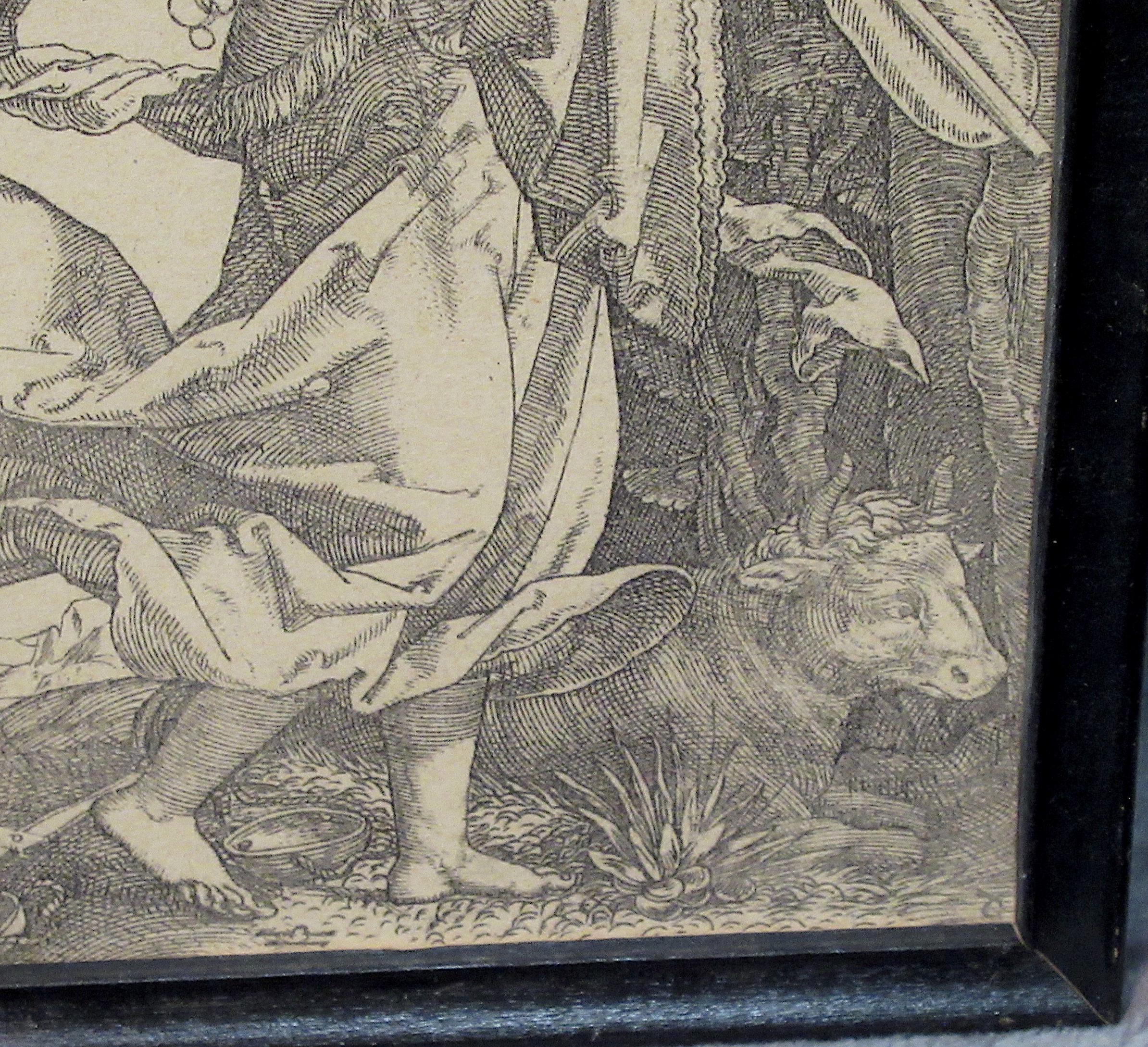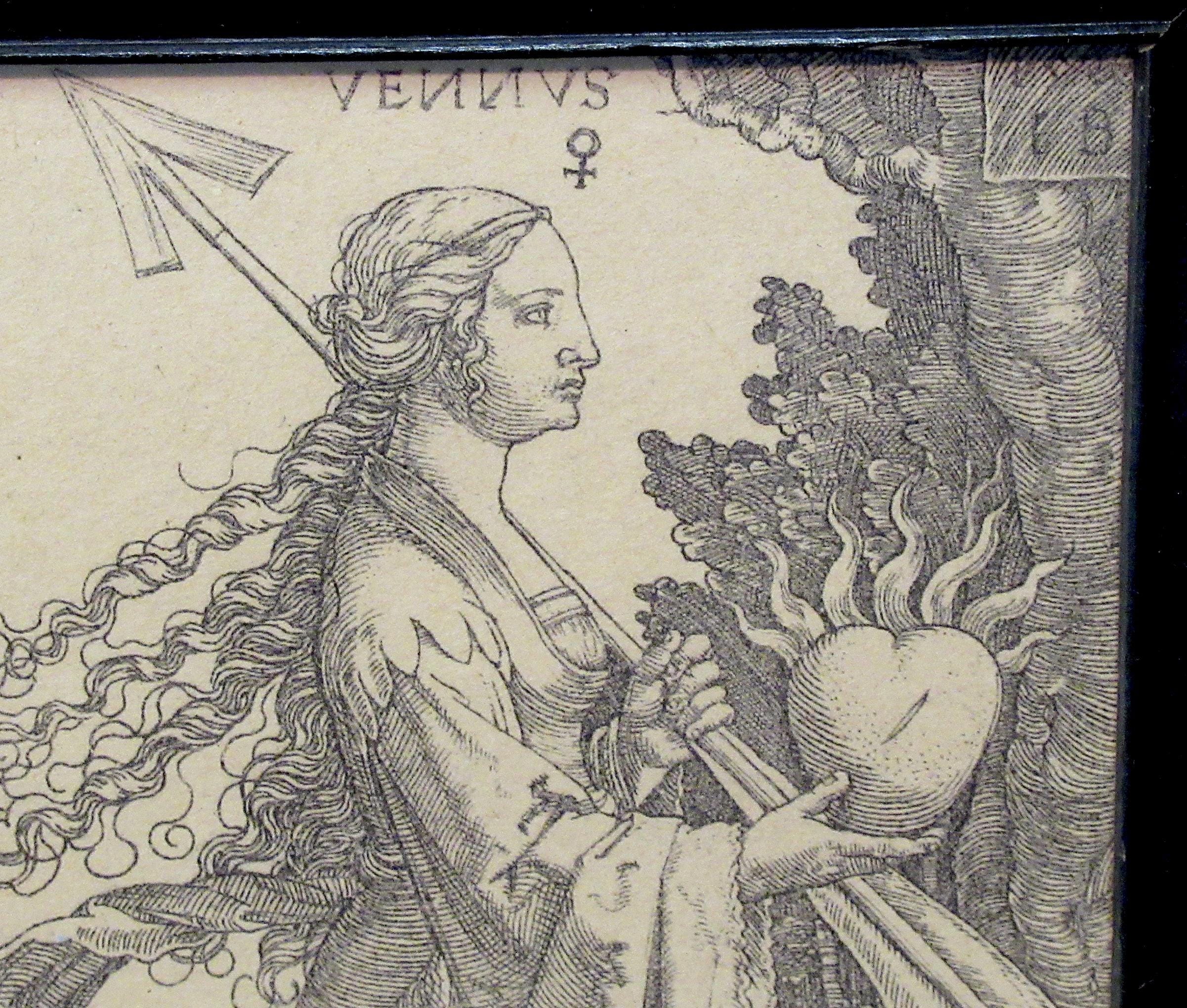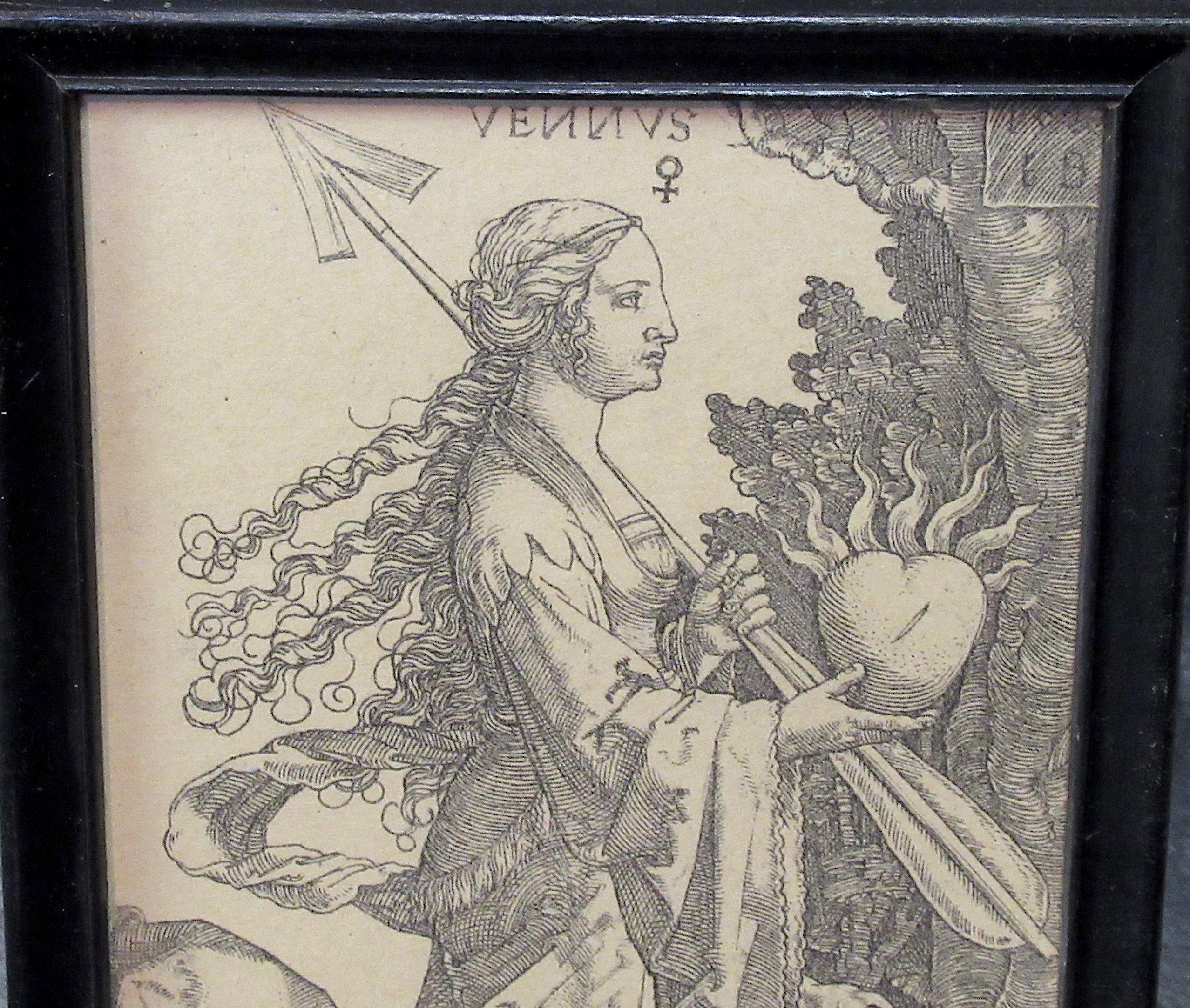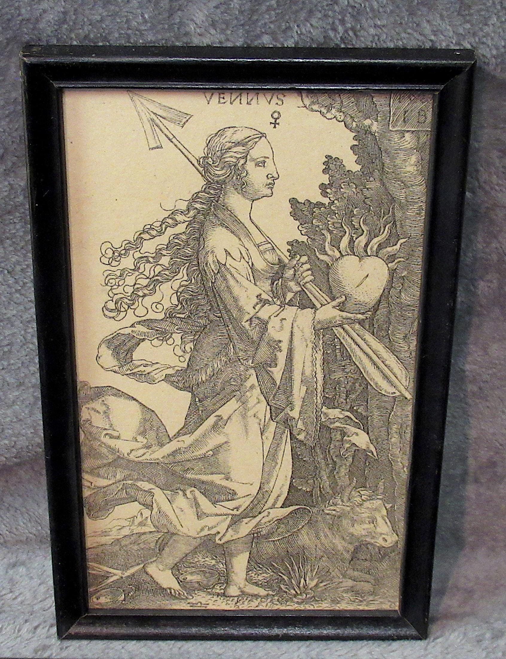 Unusual art print, not much info. " VENNUS" Woman with arrow and heart. appears signed upper date 16th century. mid 1900s printing / Vintage wood frame in super condition,