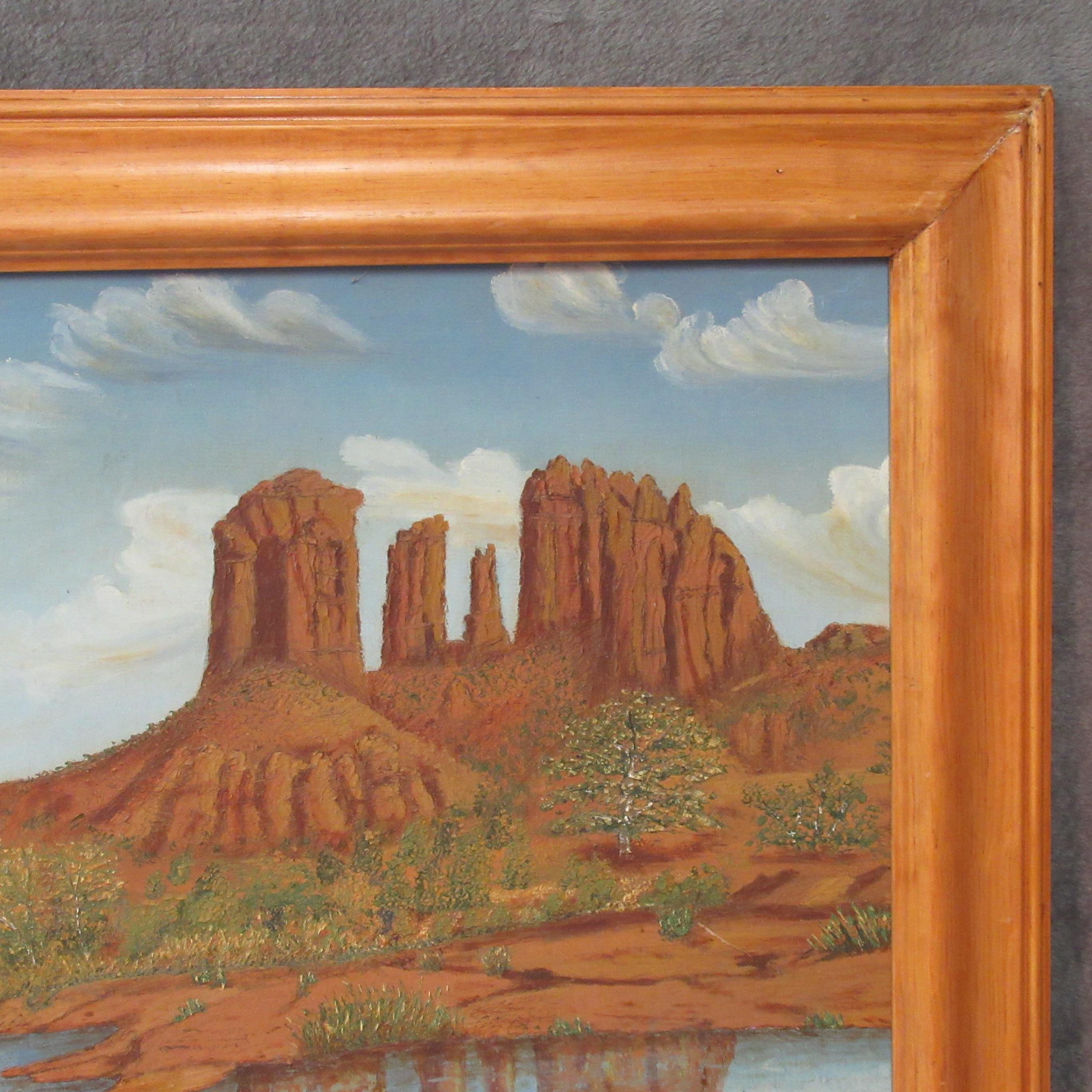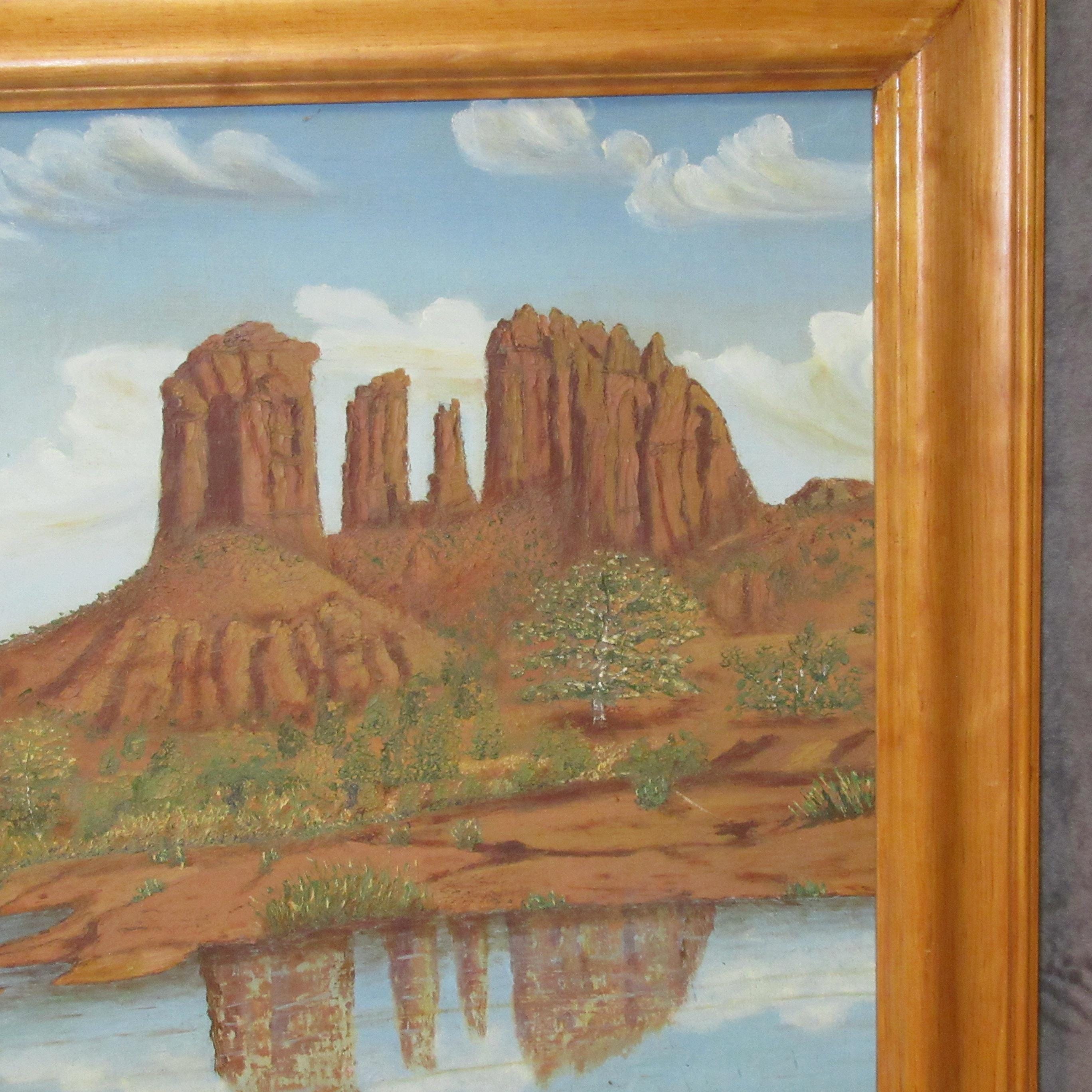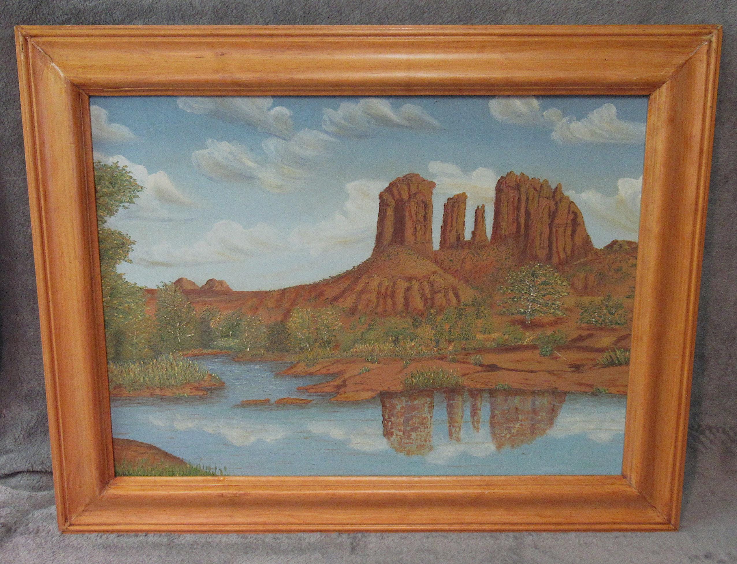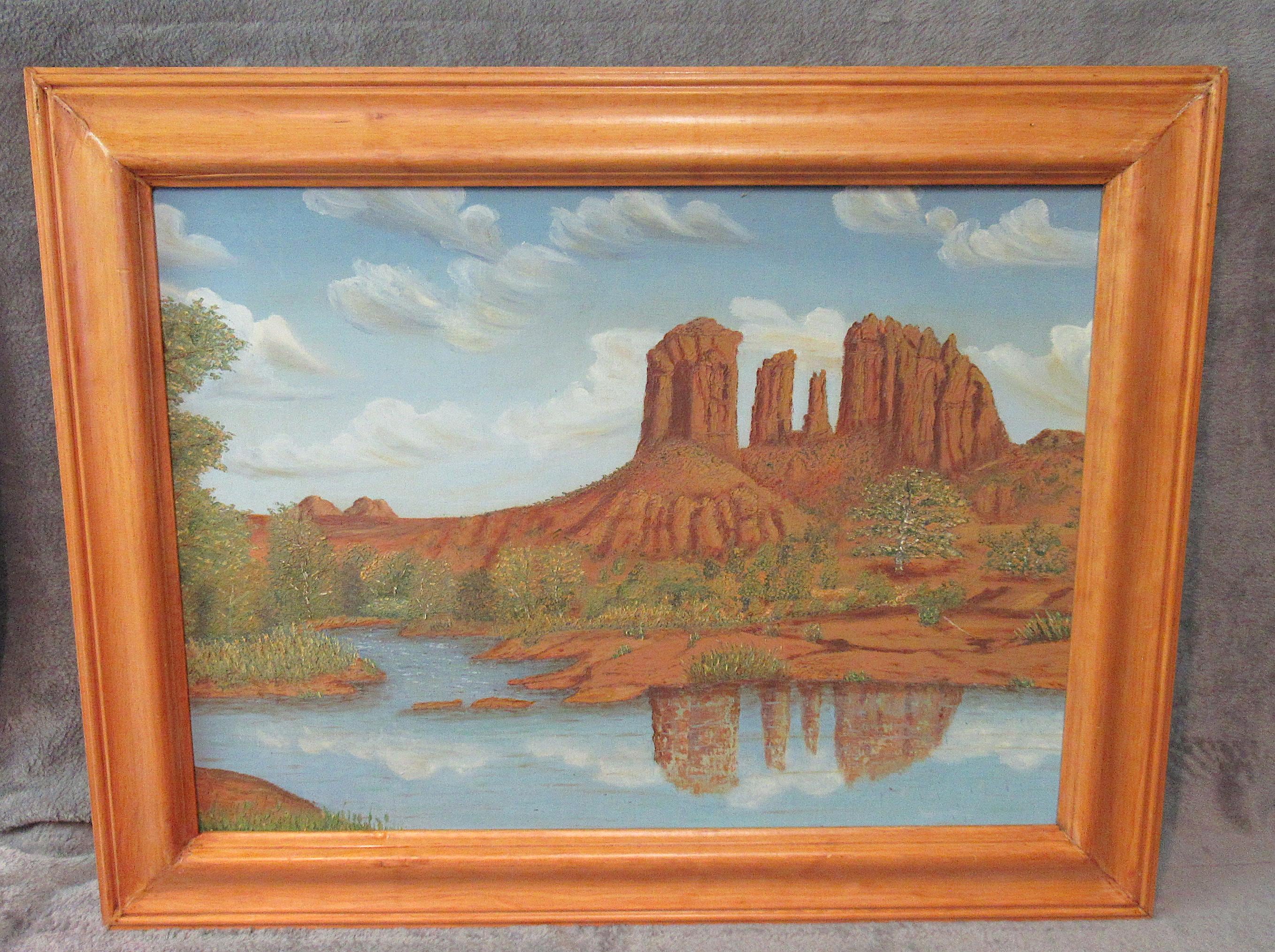 Original Oil Painting on board of Sedona area Red Rock and Lake, appears mid century in nice solid wood frame 26 X 21 excellent condition
