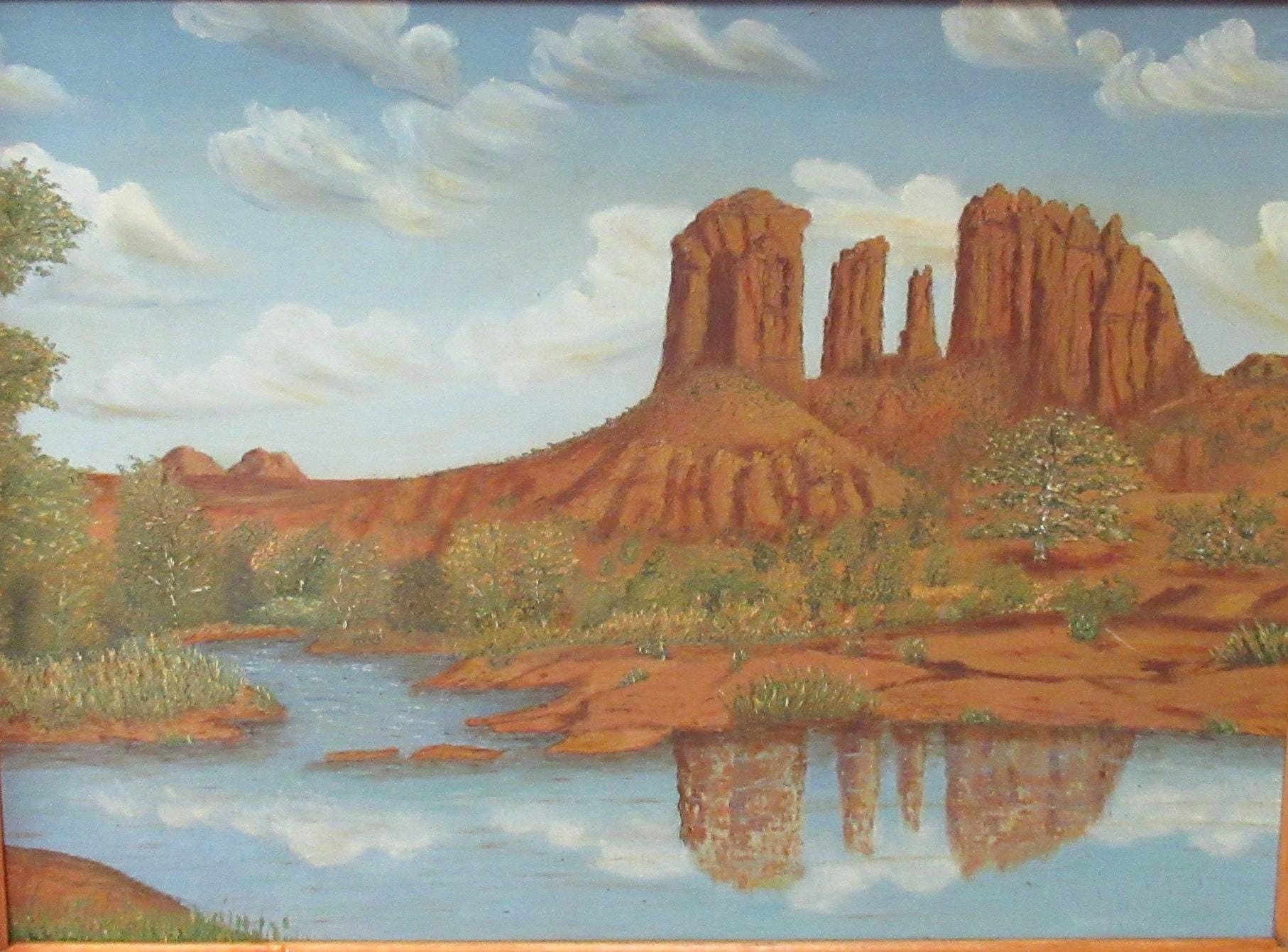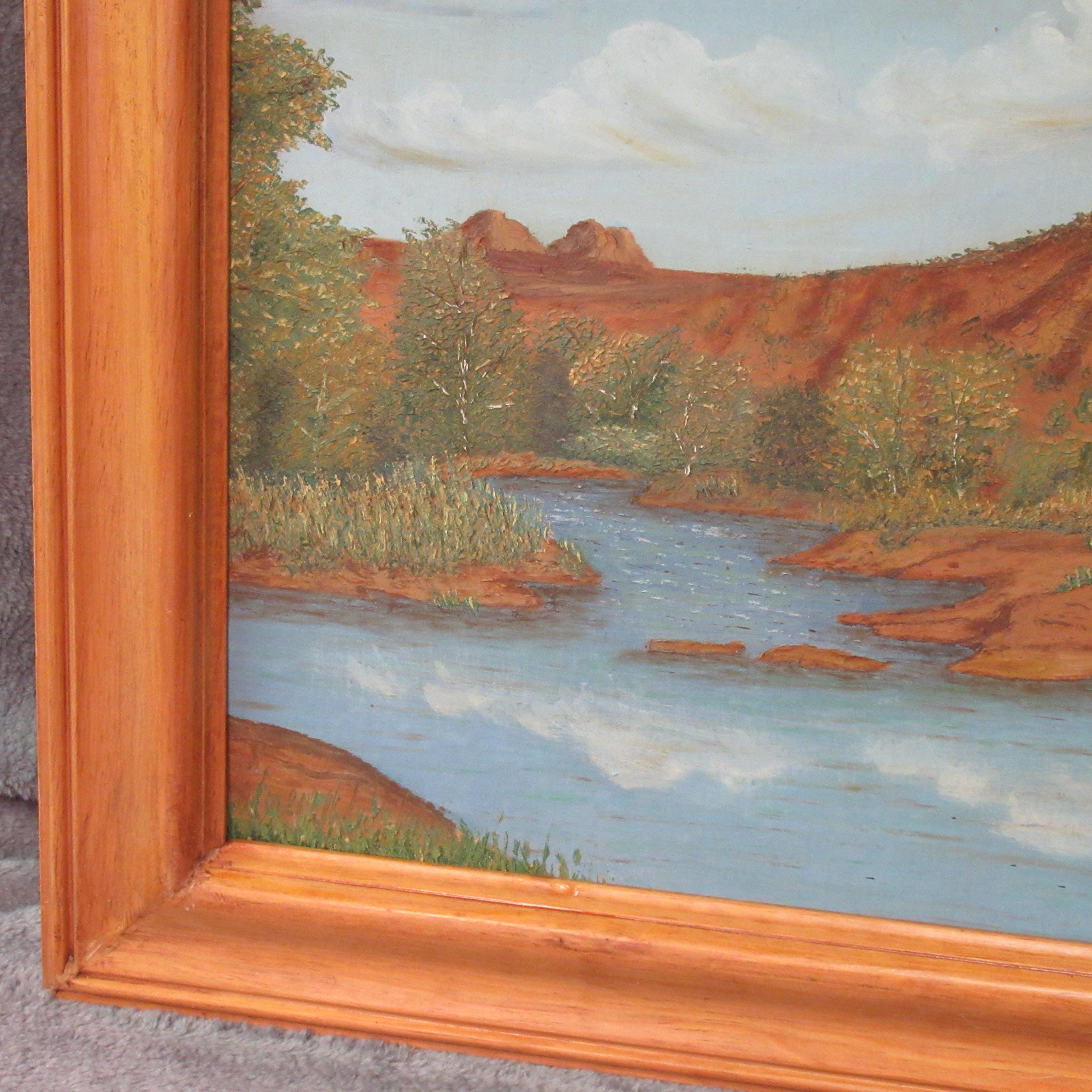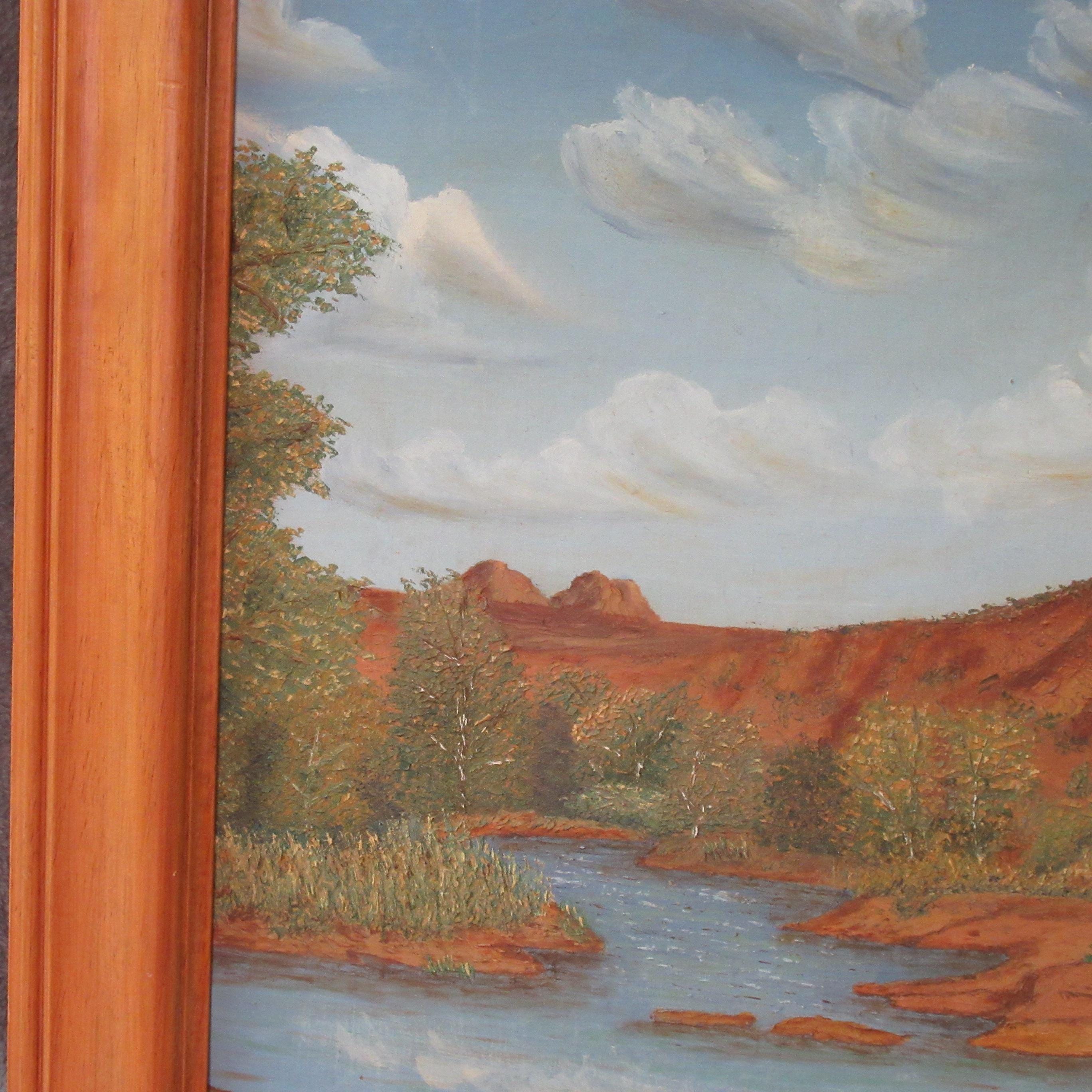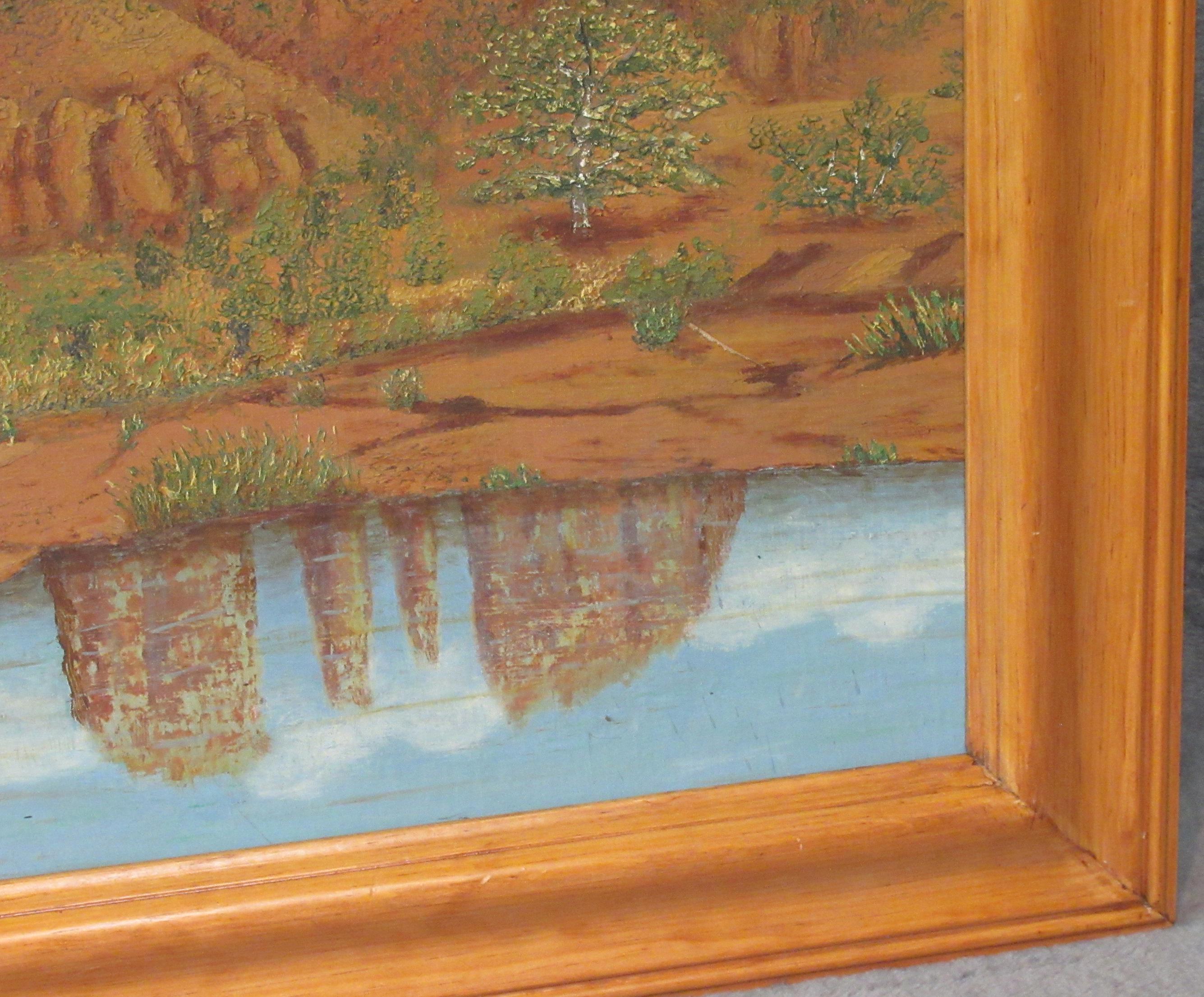 Original Oil Painting on board of Sedona area Red Rock and Lake, appears mid century in nice solid wood frame 26 X 21 excellent condition