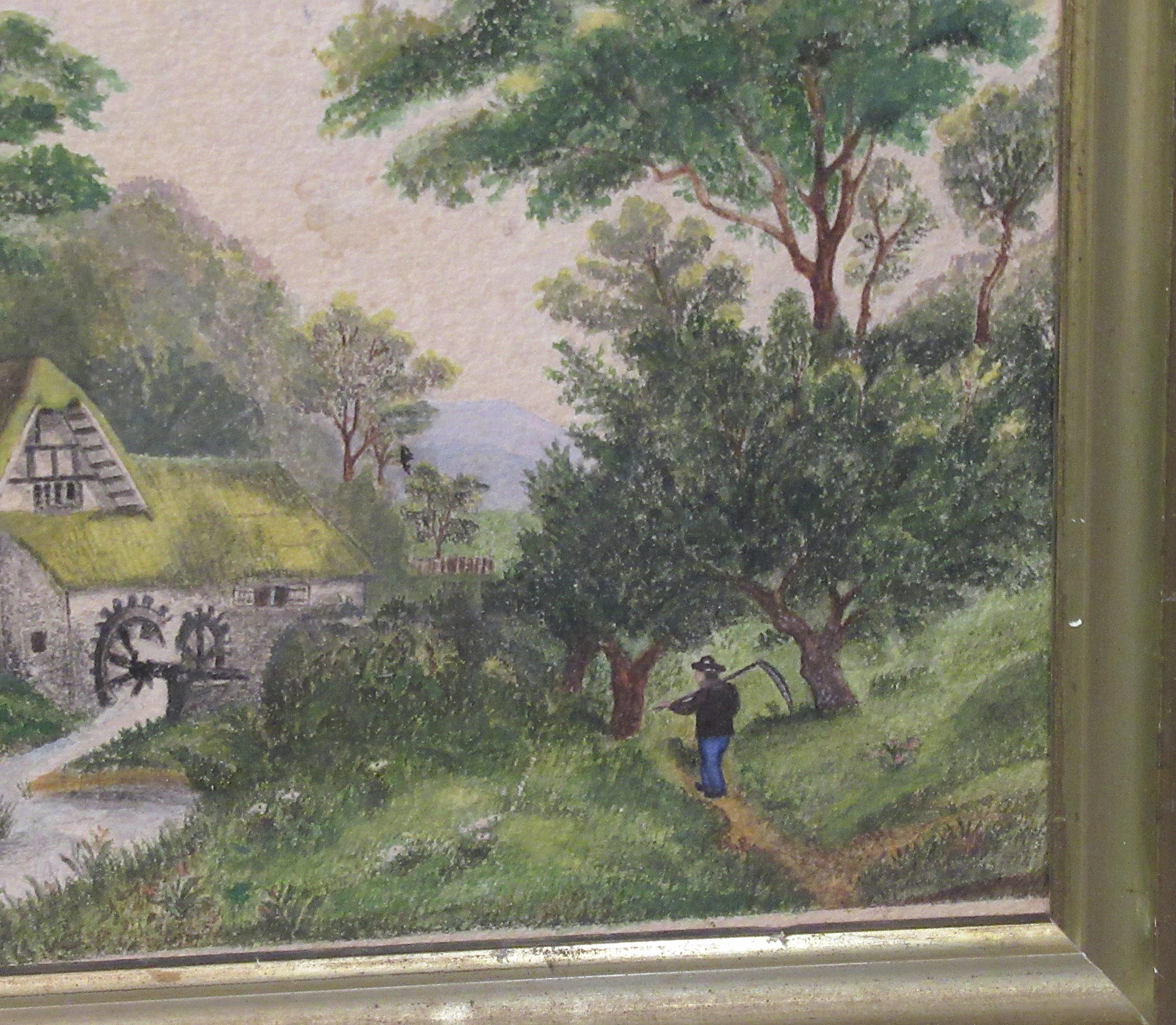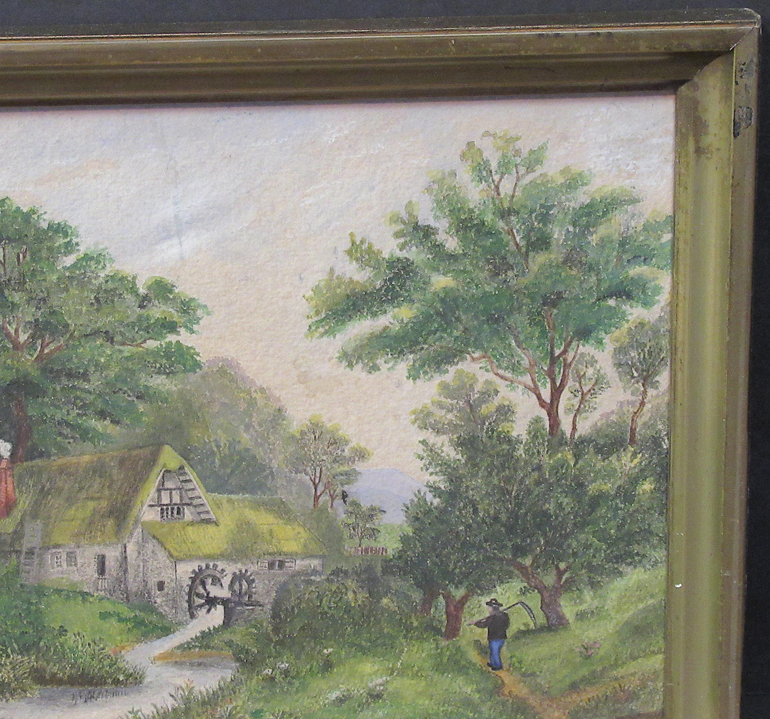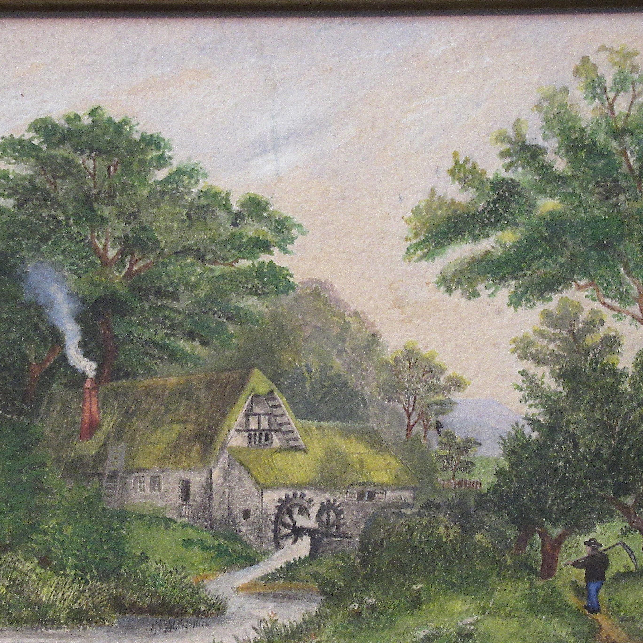 Original Hand Painted Art Early 1900s / Quality Work in fine condition / Water wheel, Early American farm home scene , slight discolor line in cloud area, Check out the detail ! Antique frame,, good size Approx 10.5 X 9