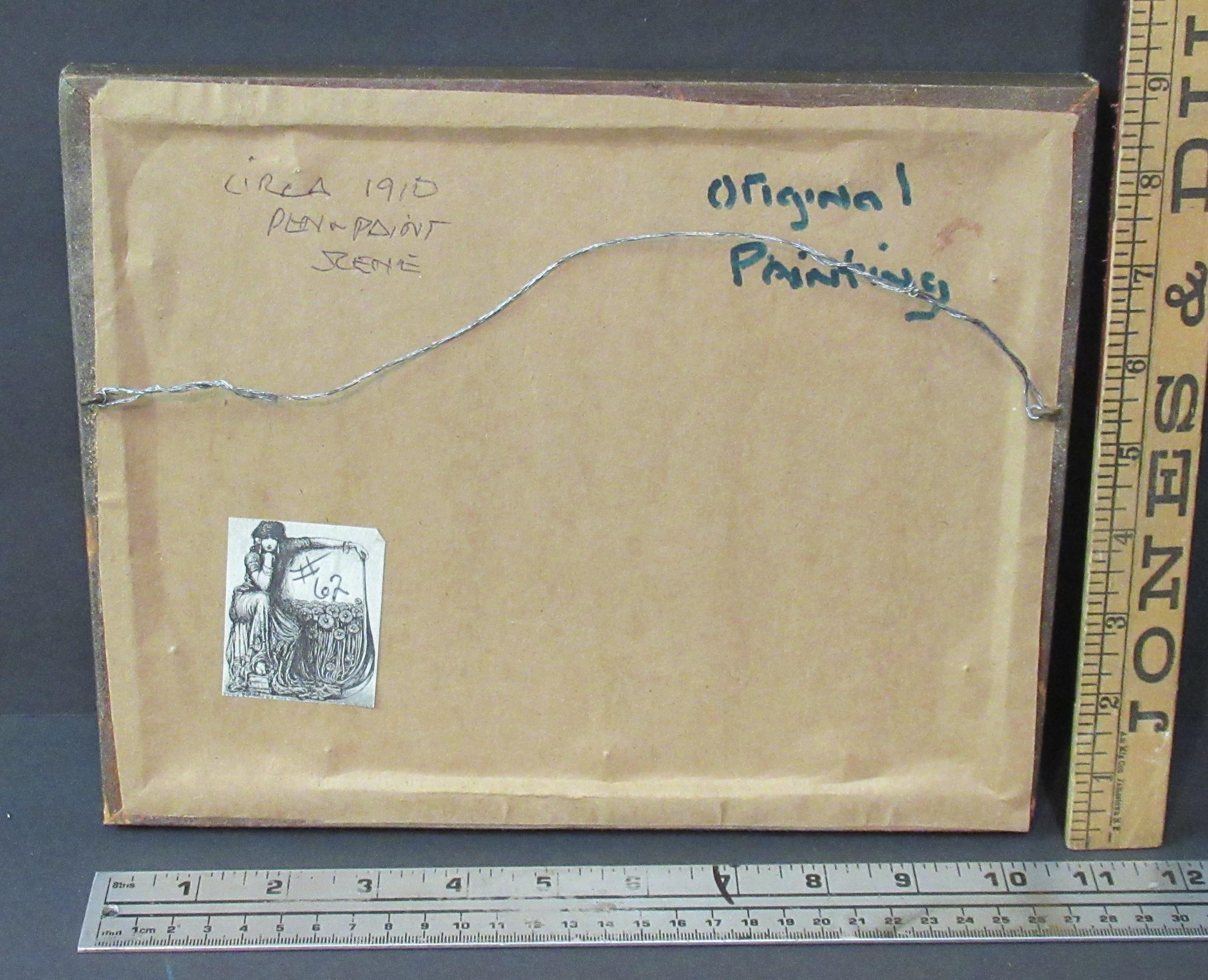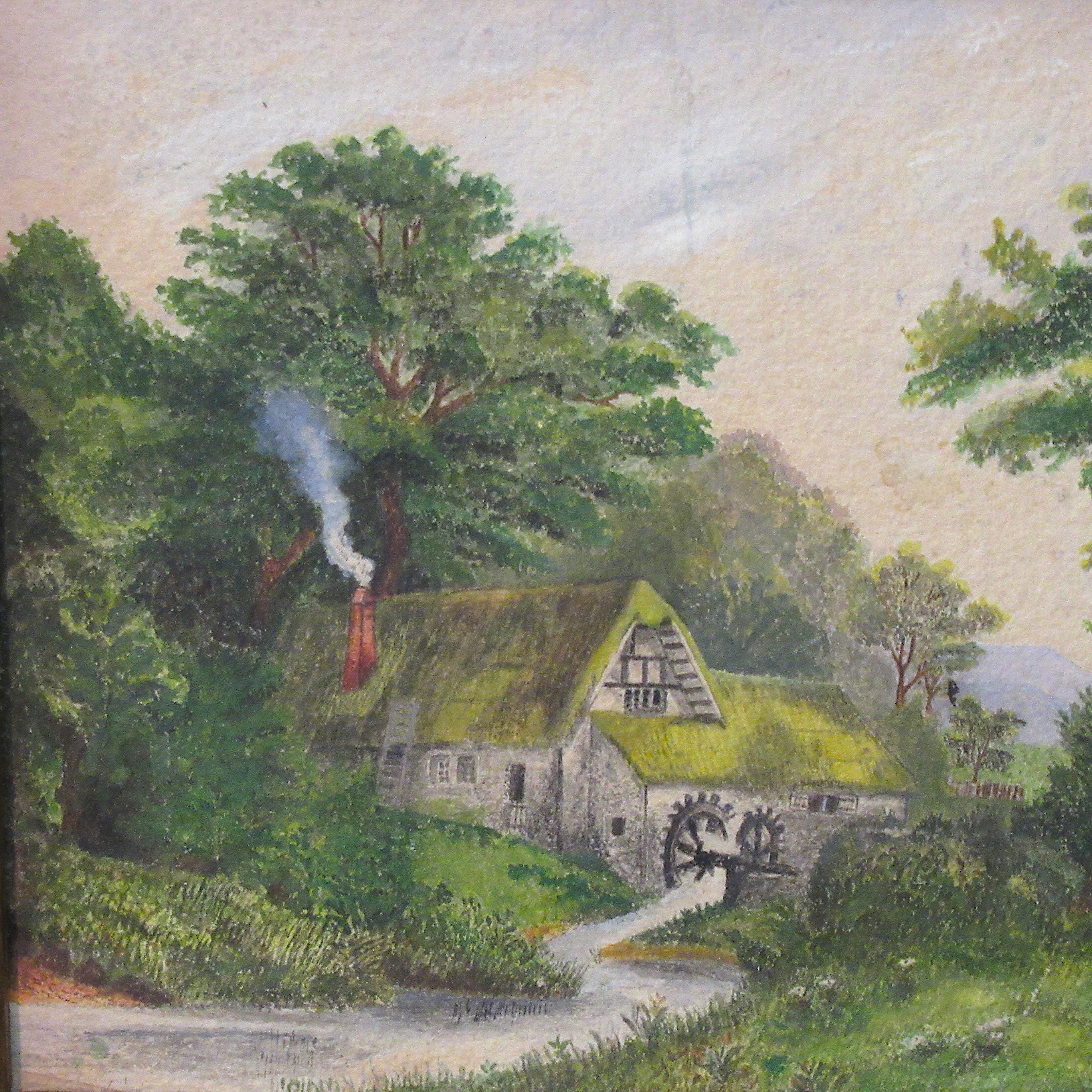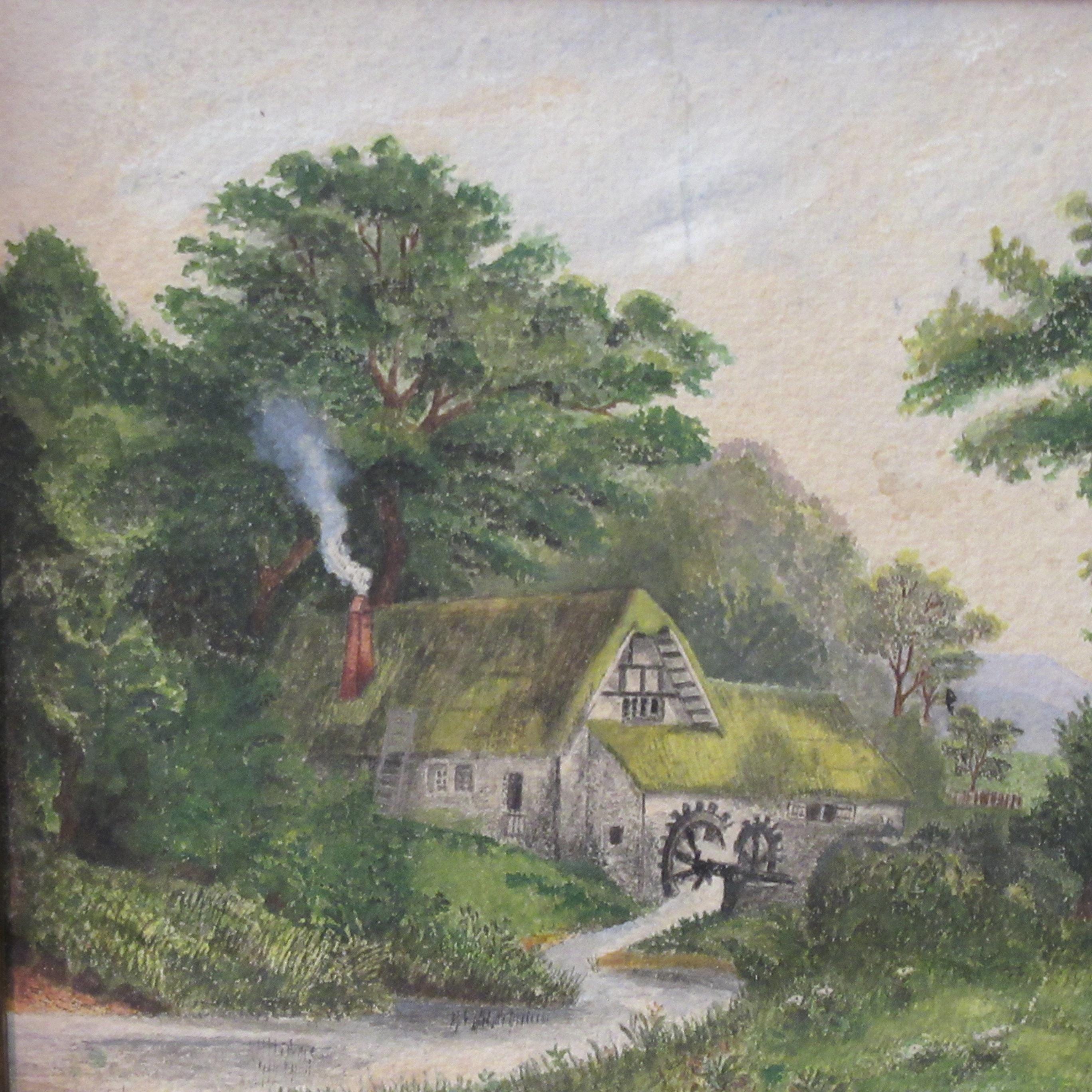 Original Hand Painted Art Early 1900s / Quality Work in fine condition / Water wheel, Early American farm home scene , slight discolor line in cloud area, Check out the detail ! Antique frame,, good size Approx 10.5 X 9