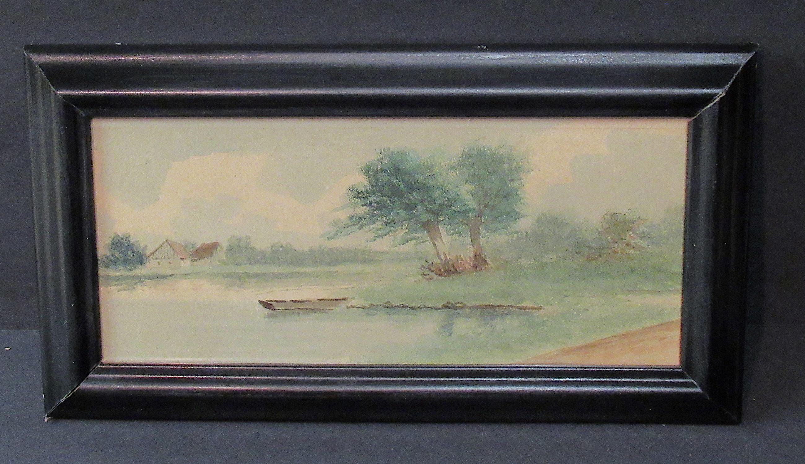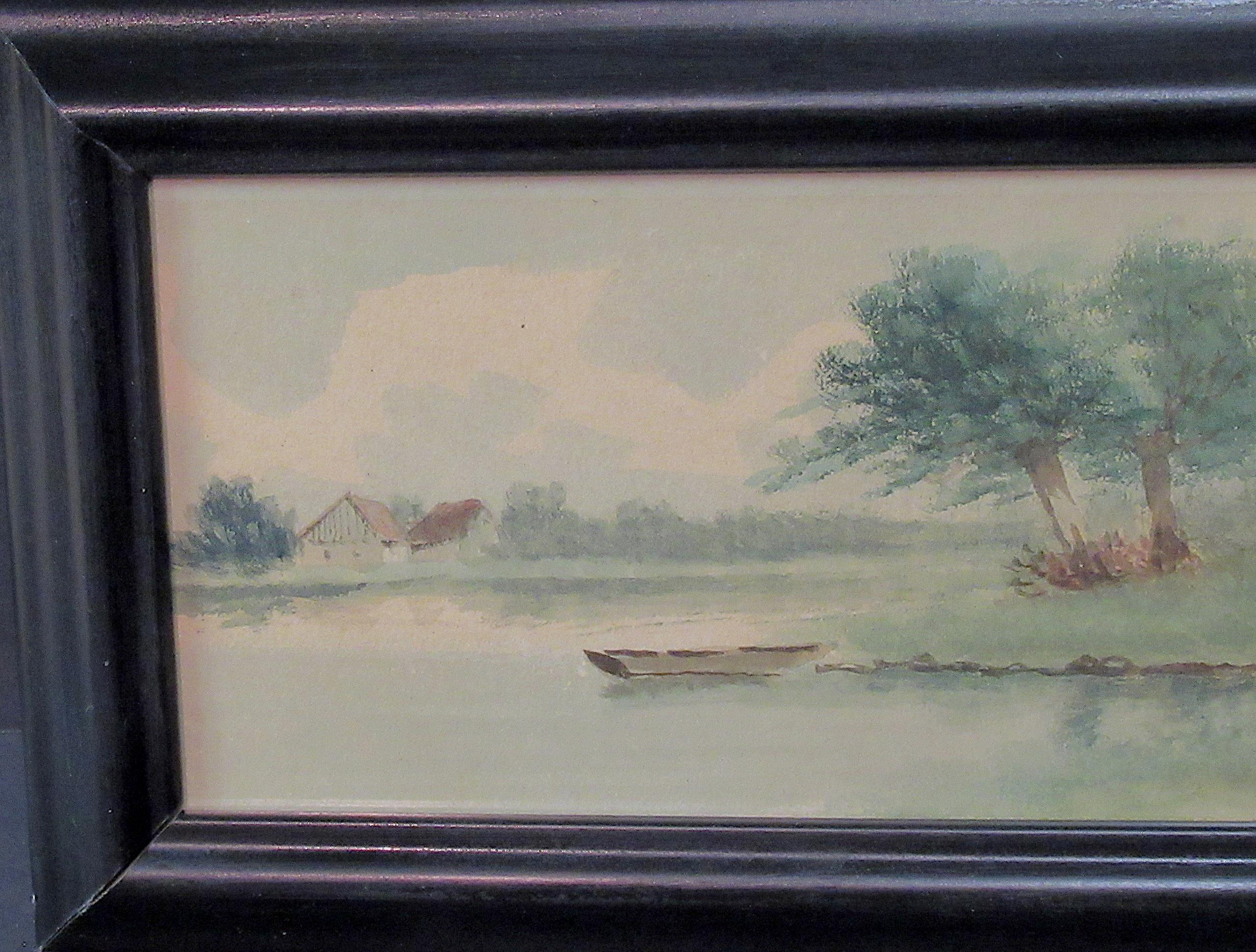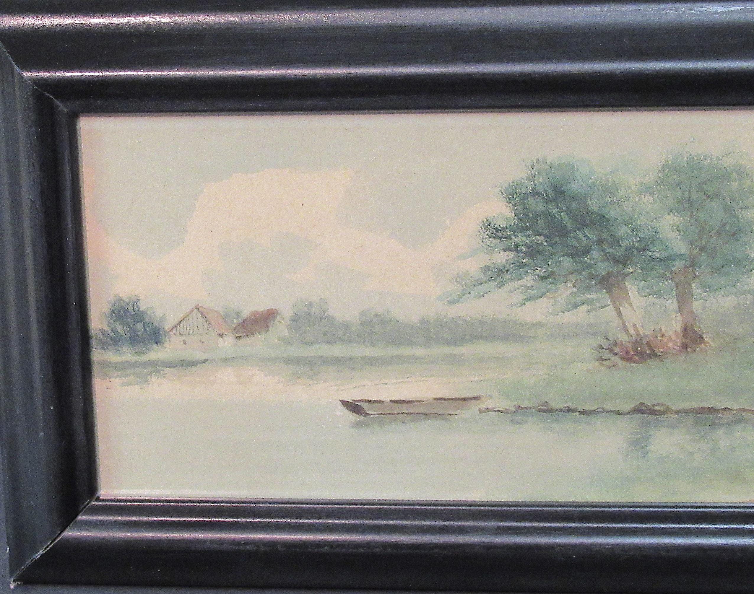 Original Early American Painting, Lake and farm scene with skiff . Its the excellent quality of the painter that makes this one / under glass in recent custom frame, smaller diminutive good color / Nice original old oil painting appears early 1900s / approx. 11 X 6.5