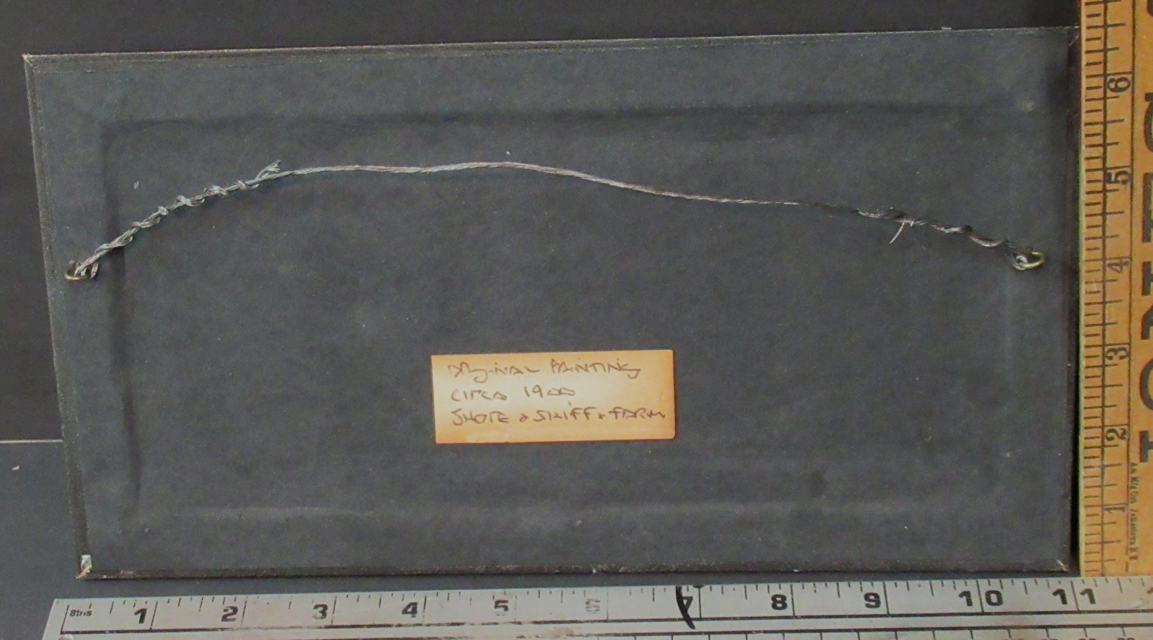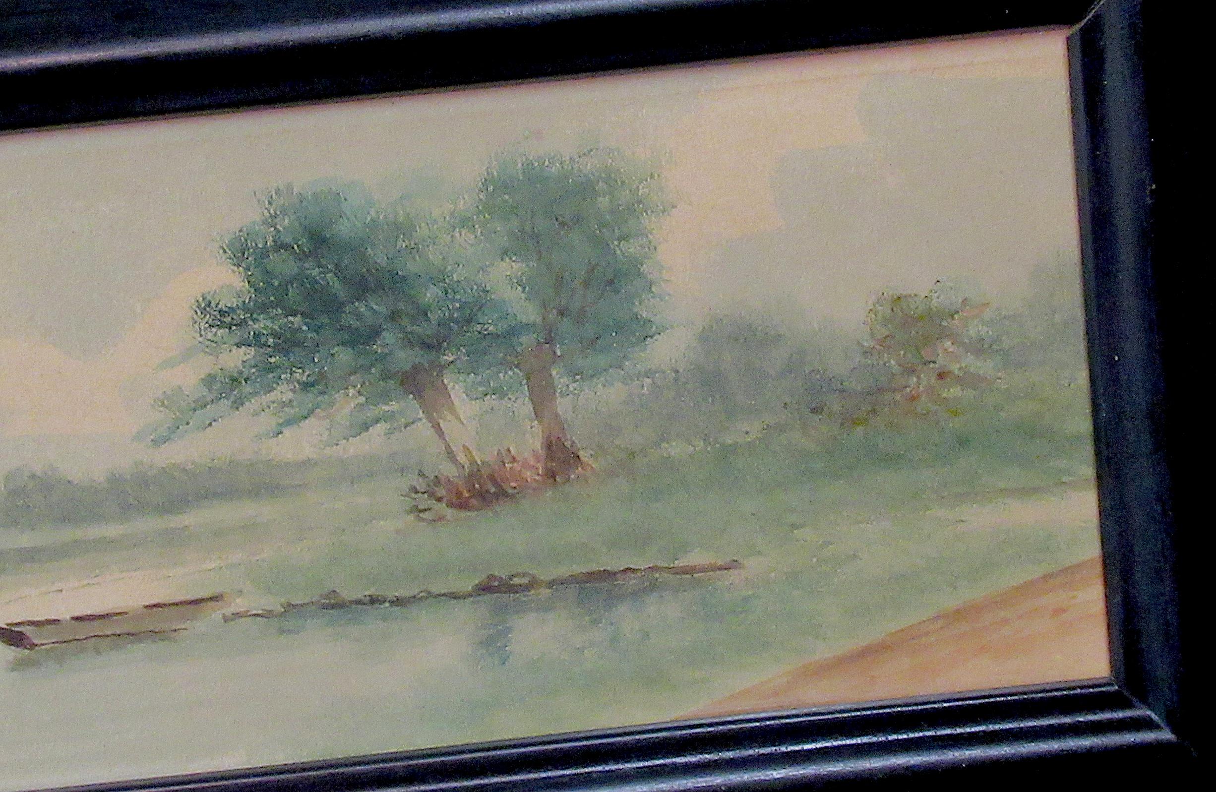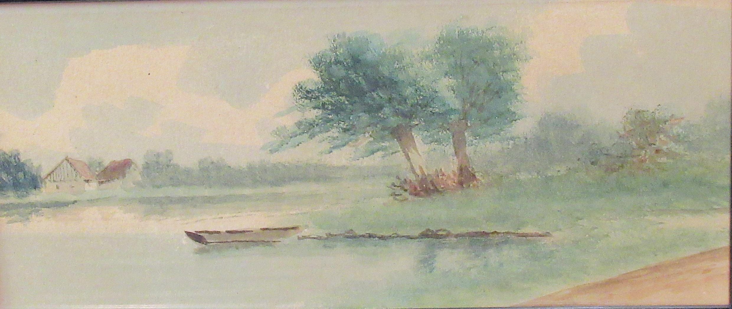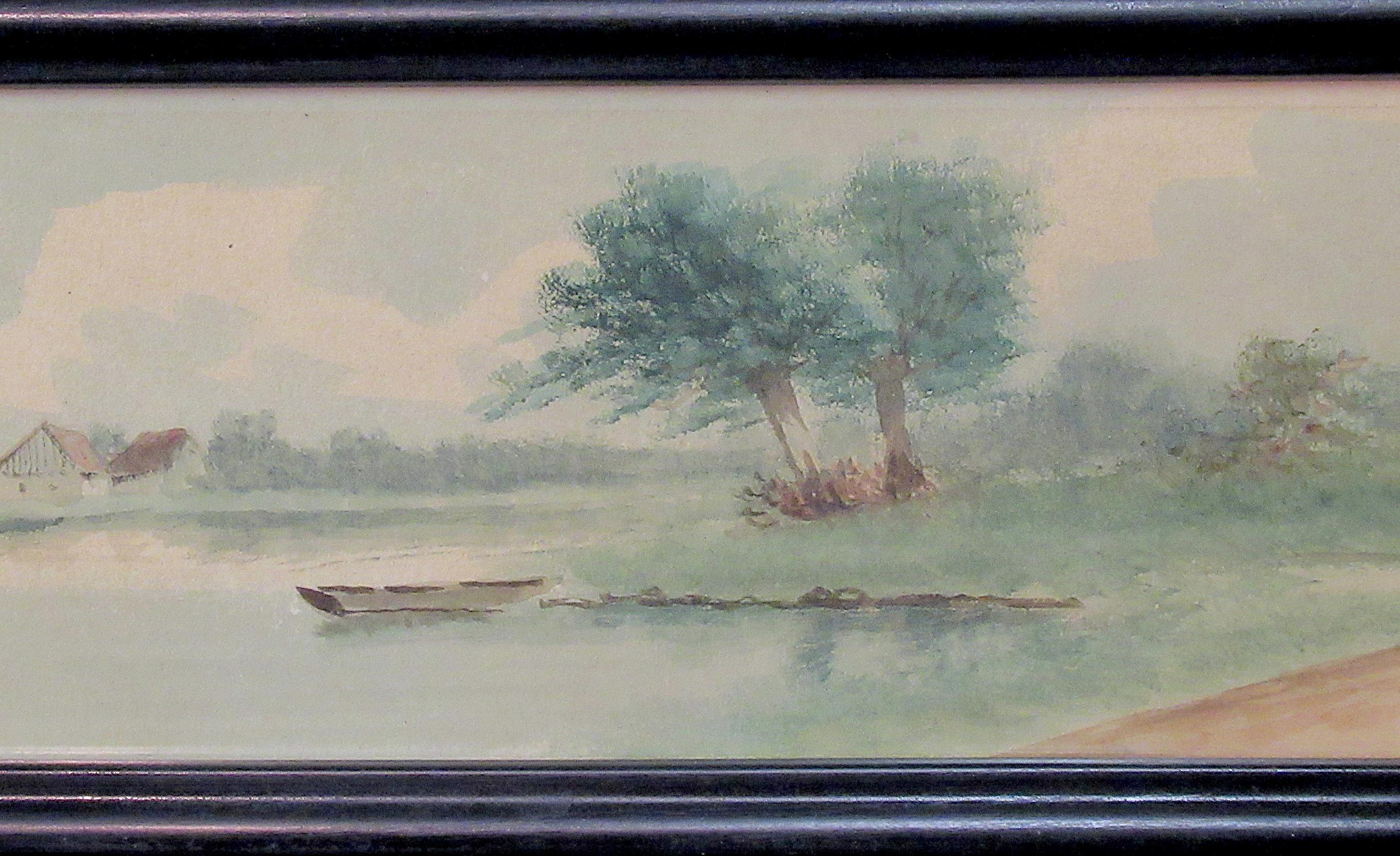Original Early American Painting, Lake and farm scene with skiff . Its the excellent quality of the painter that makes this one / under glass in recent custom frame, smaller diminutive good color / Nice original old oil painting appears early 1900s / approx. 11 X 6.5