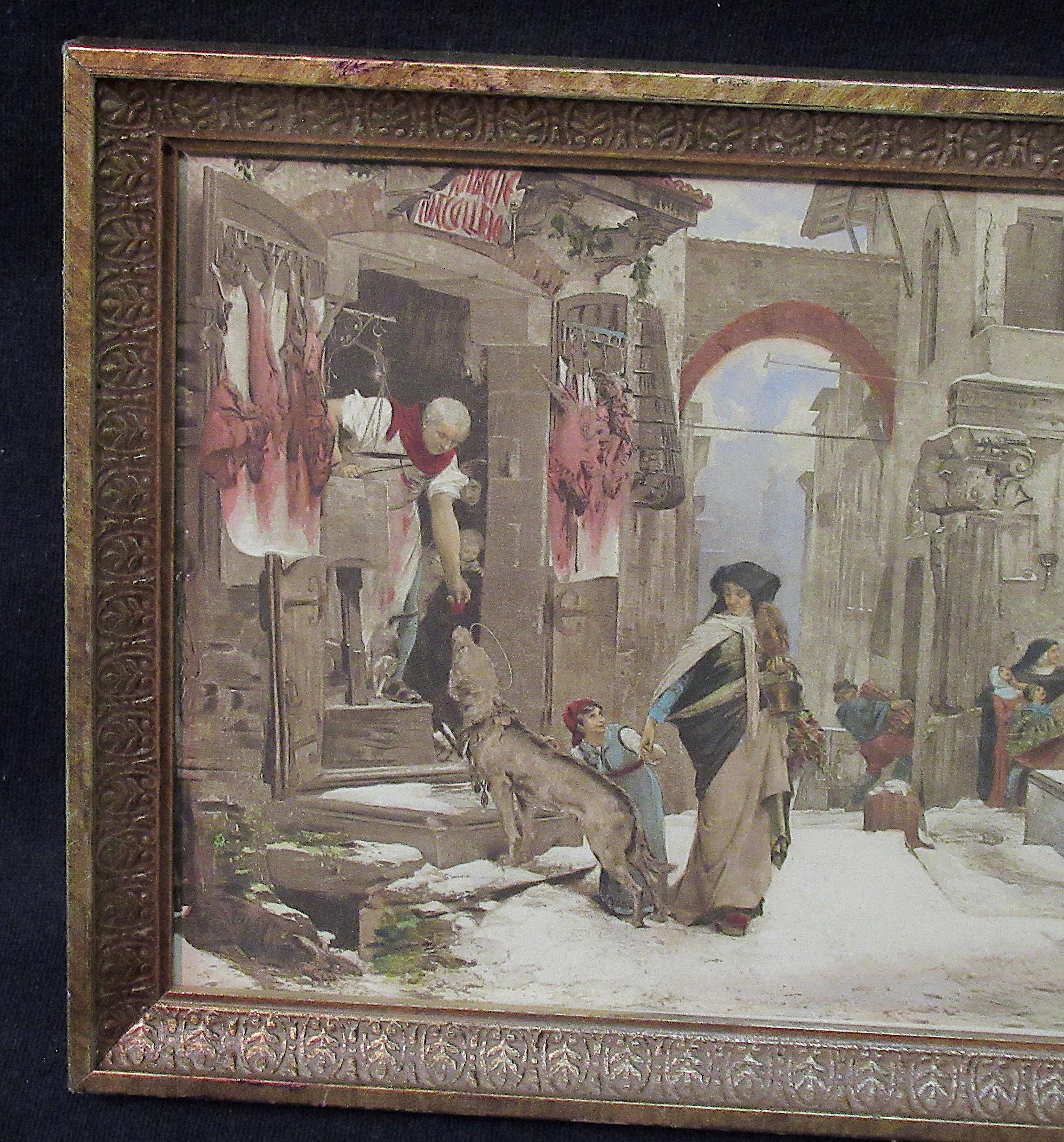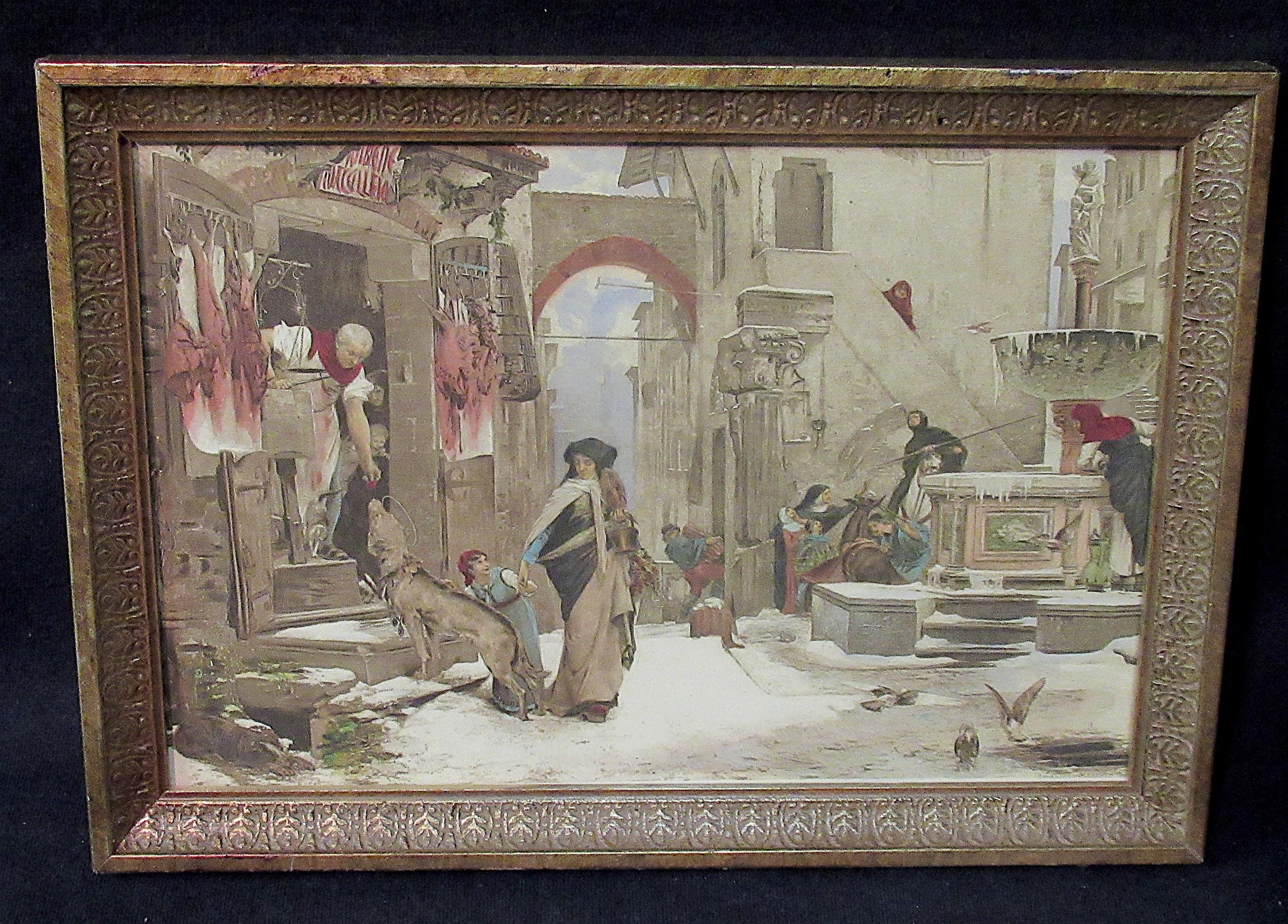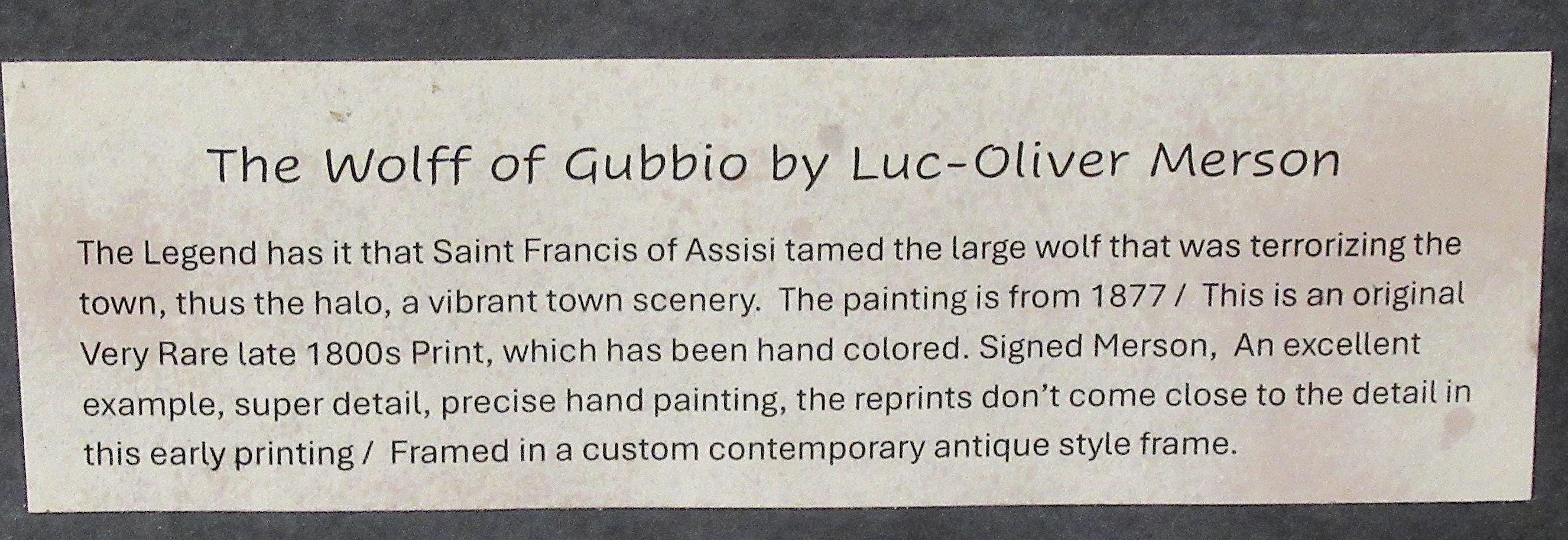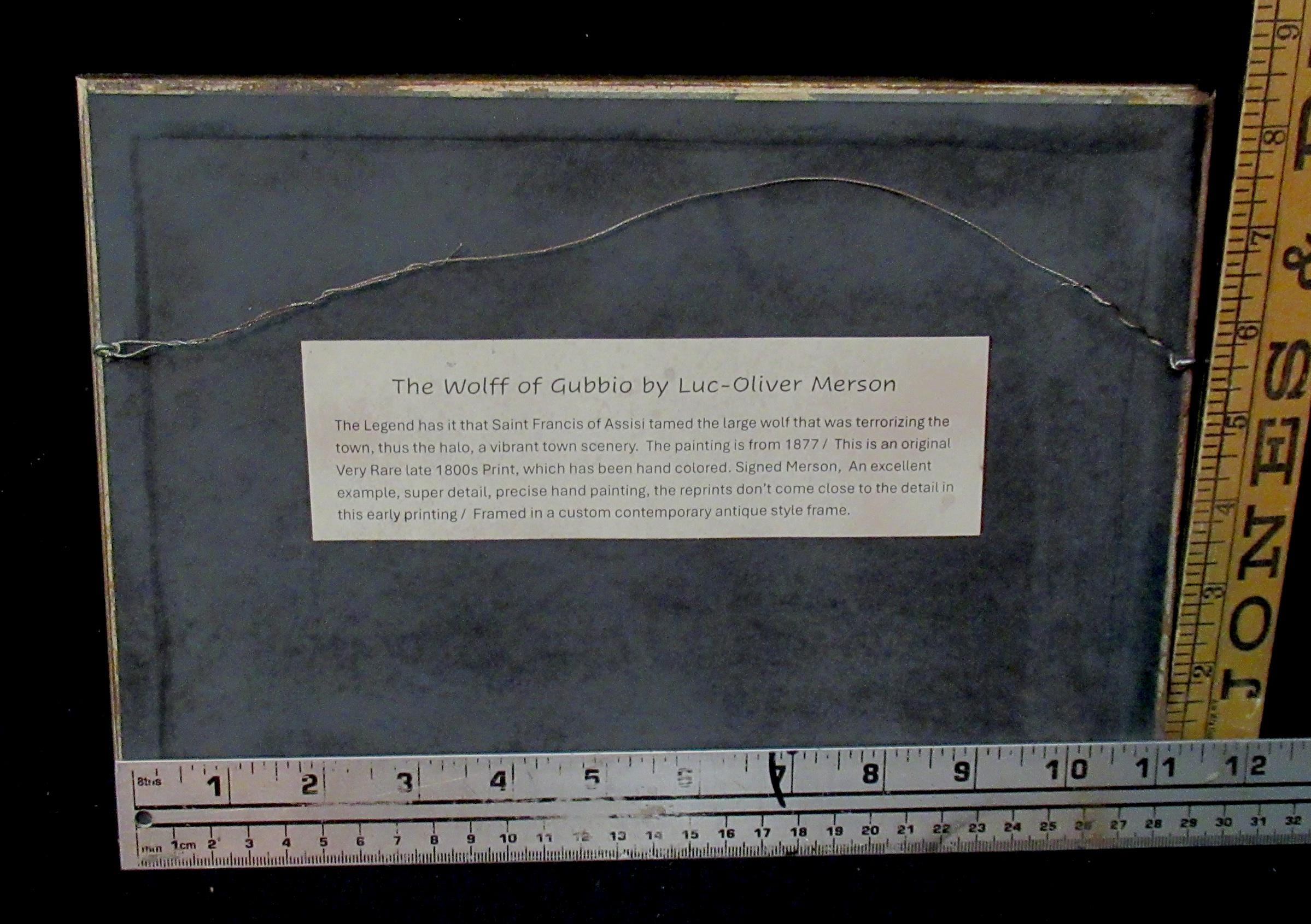 The Legend has it that Saint Francis of Assisi tamed the large wolf that was terrorizing the town, thus the halo, a vibrant town scenery. The painting is from 1877 / This is an original Very Rare late 1800s Print, which has been hand colored. Signed Merson, An excellent example, super detail, precise hand painting, the reprints don’t come close to the detail in this early printing / Framed in a custom contemporary antique style frame. Excellent detail and color this early original art print from circa 1890 appears in perfect condition, Framed in antique style contemporary frame 11 X 8.5 OSD