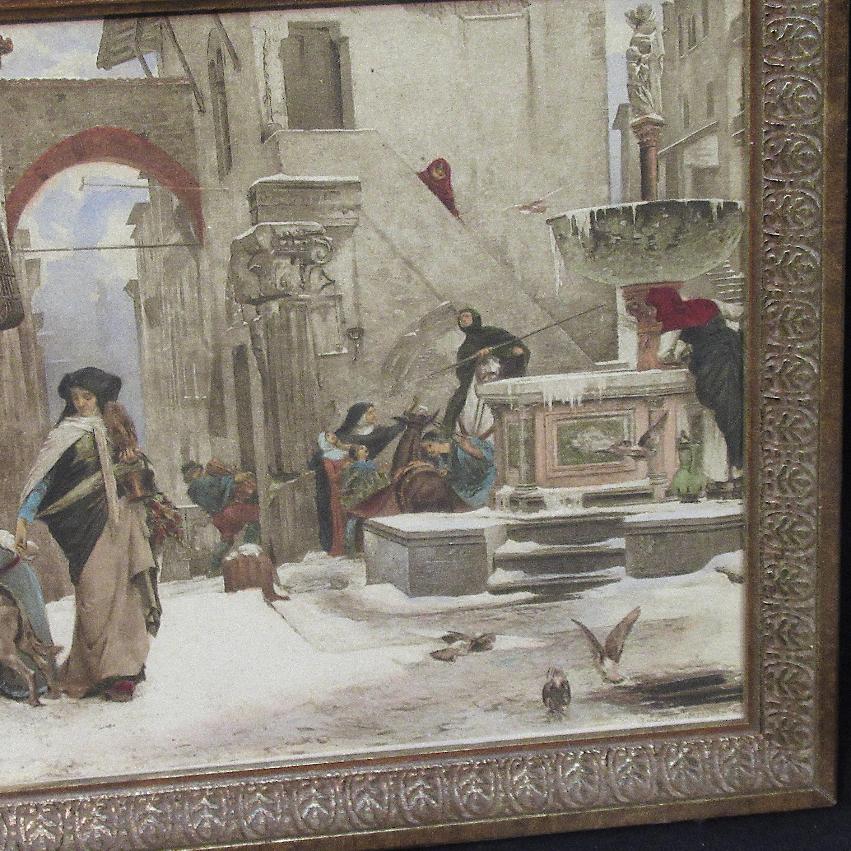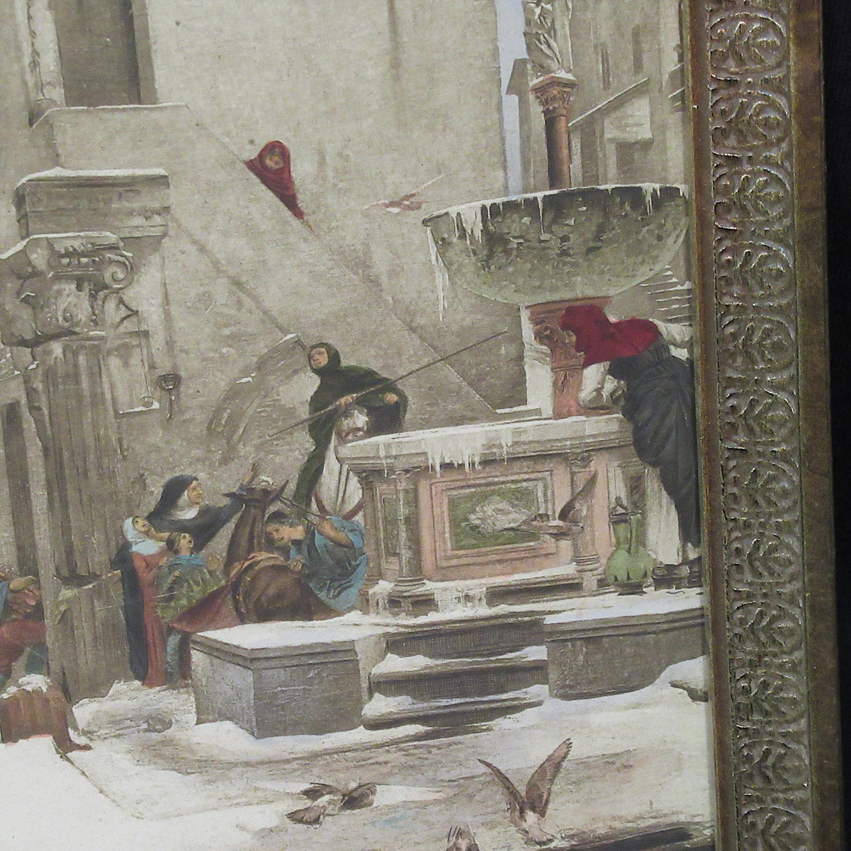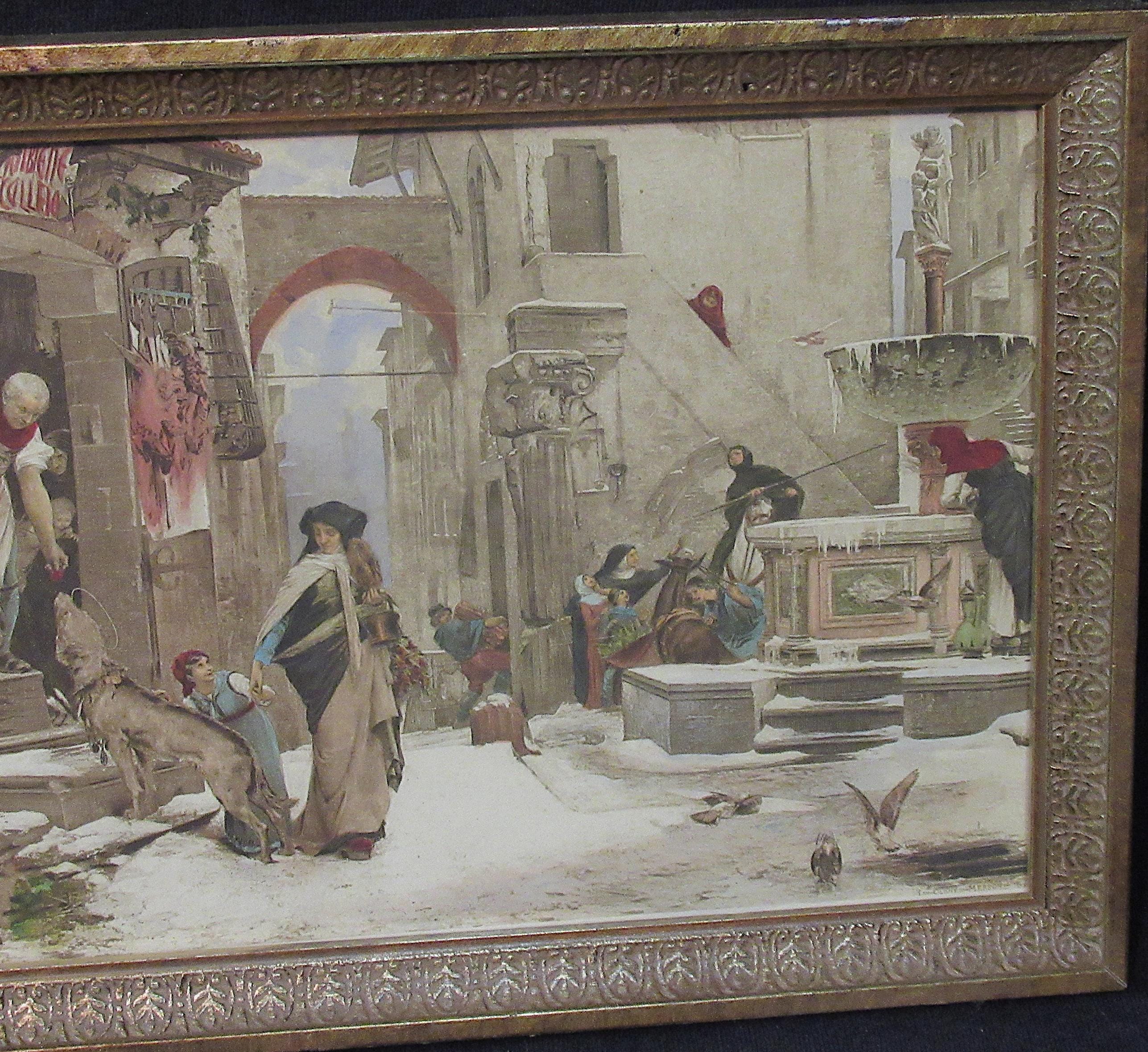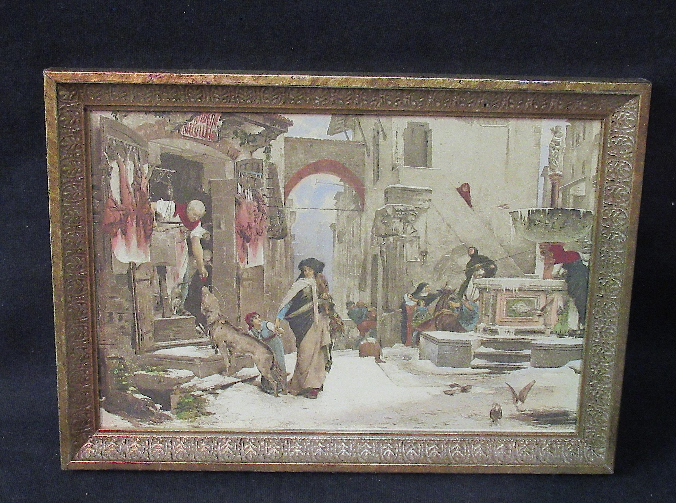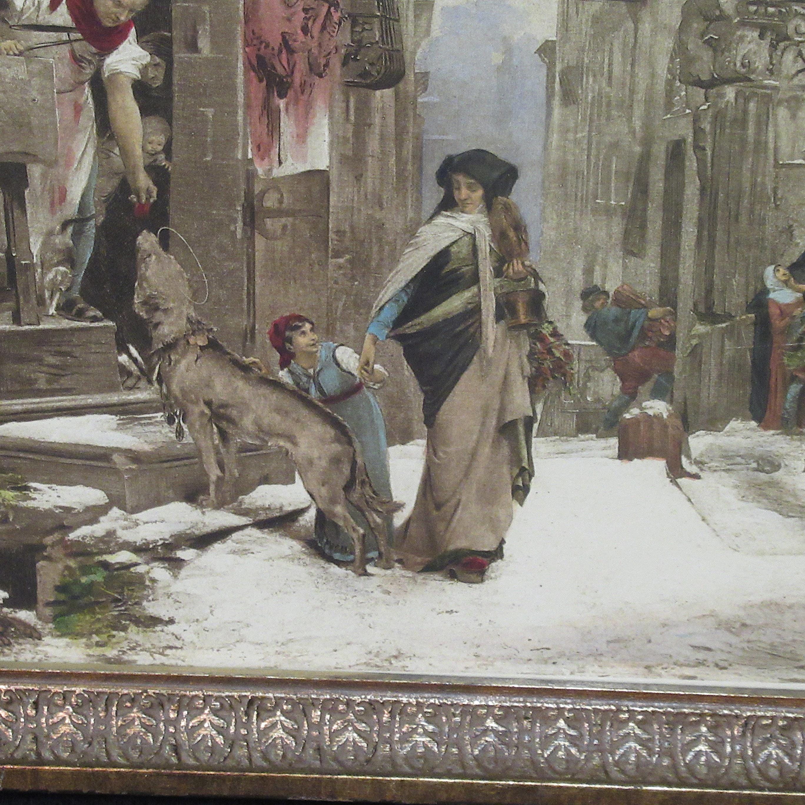 The Legend has it that Saint Francis of Assisi tamed the large wolf that was terrorizing the town, thus the halo, a vibrant town scenery. The painting is from 1877 / This is an original Very Rare late 1800s Print, which has been hand colored. Signed Merson, An excellent example, super detail, precise hand painting, the reprints don’t come close to the detail in this early printing / Framed in a custom contemporary antique style frame. Excellent detail and color this early original art print from circa 1890 appears in perfect condition, Framed in antique style contemporary frame 11 X 8.5 OSD
